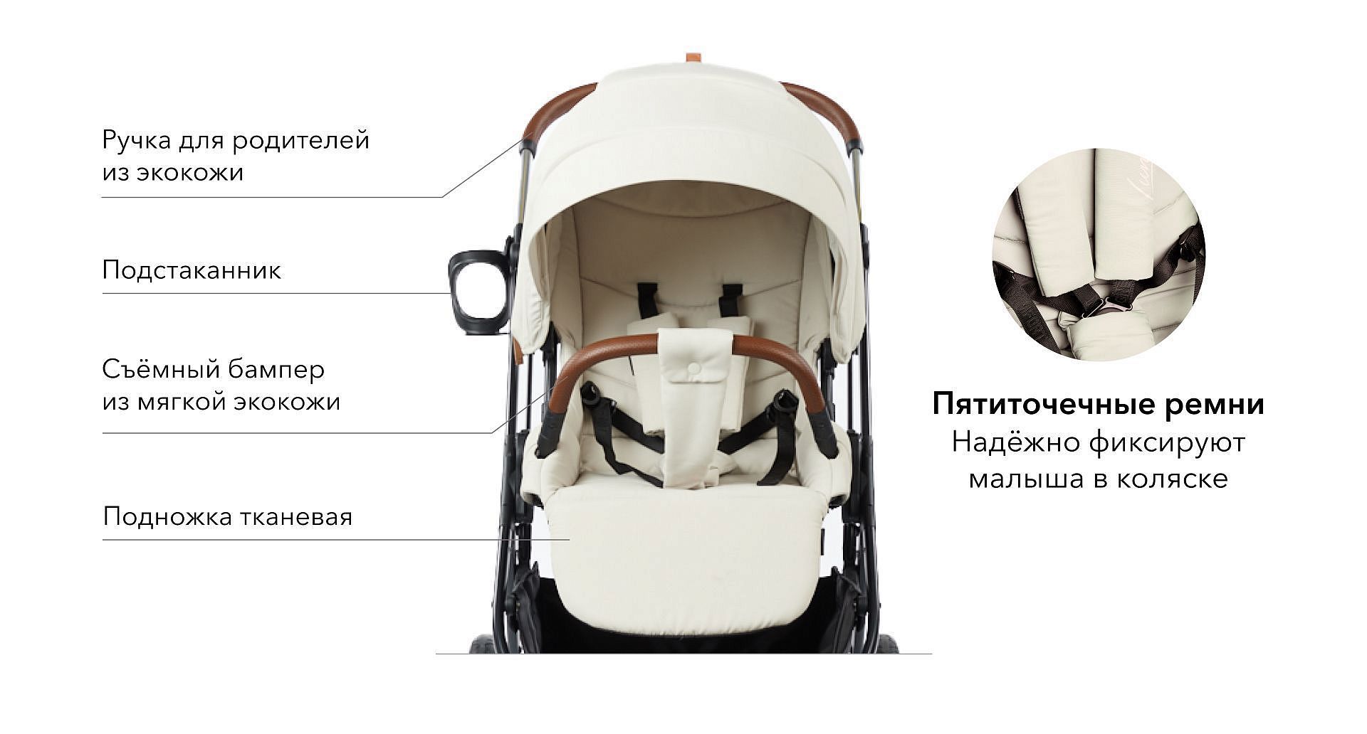 Коляска имеет стильный внешний вид. Регулируемая спинка и подножка позволят долго и удобно пользоваться коляской, ведь в ней не только комфортно сидеть и наблюдать за окружающим миром, но и удобно спать во время прогулки. Большой капюшон надежно закроет люльку с новорожденным или уже подросшего ребенка от любой непогоды. Благодаря реверсивному сидению, вы сможете сами решить, как везти ребенка во время прогулки: по ходу или против хода движения. Очень удобная функция позволит во время прогулки с новорожденным контролировать его сон, подросшего ребенка развернуть от ветра или очень яркого солнца. Увеличенные колеса с мягким наполнителем ЭВА имеют все преимущества надувных колес, но при этом не нуждаются в подкачке и не прокалываются, а больший диметр делает коляску еще проходимей и устойчивей на любом покрытии. Передние колеса поворачиваются на 360° с возможностью фиксации, поэтому коляска маневренная и легкая в управлении. Малыш надежно фиксируется пятиточечными ремнями, а для дополнительной безопасности и комфорта предусмотрен съемный бампер из экокожи.