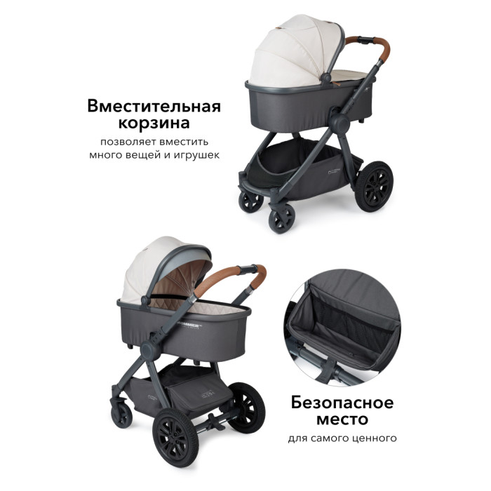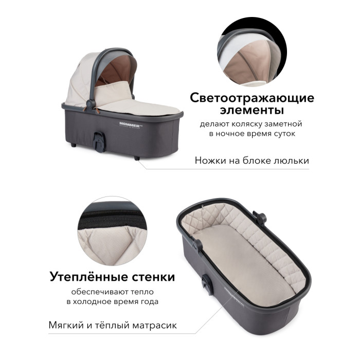 Главный плюс этой модели в качестве исполнения. Каждая деталь в коляске продумана, и сделана так, чтобы вам было удобно пользоваться коляской, а ребенку было комфортно в ней. Например, коляска оснащена светоотражающими полосками, благодаря чему будет более заметна в темное время суток, что повысит вашу безопасность на дороге. Люлька утеплена и имеет мягкие бортики их натурального материала. Теплый и мягкий матрасик уже в комплекте. Под люлькой предусмотрены ножки, чтобы можно было спокойно ставить люльку на пол и не переживать что она испачкается. Прогулочный блок очень компактен в сложенном виде и легко устанавливается на раму коляски в двух направлениях: к маме или по направлению движения. У него большое спальное место, удобно регулируемая спинка и подножка. Бампер выполнен из качественной эко кожи, что повысит его долговечность и удобство в уходе.