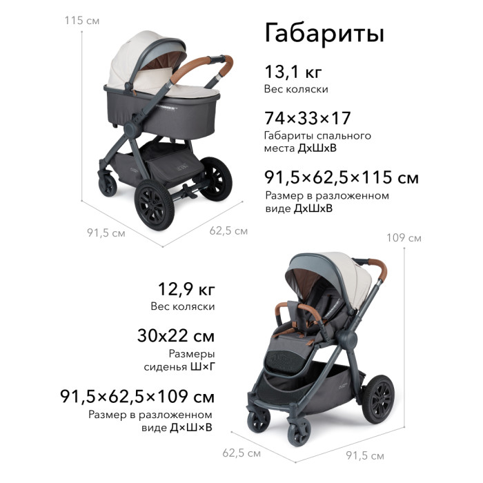 Размеры в разложенном виде ДхШхВ в прогулочном варианте: 91,5x62,5x109 см