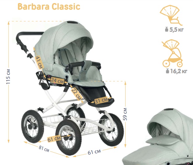 - Габариты в собранном виде (д/ш/в) (см): 110/61/120 см, длина по колесам - 81 см, высота от пола до верхнего края люльки - 76 см