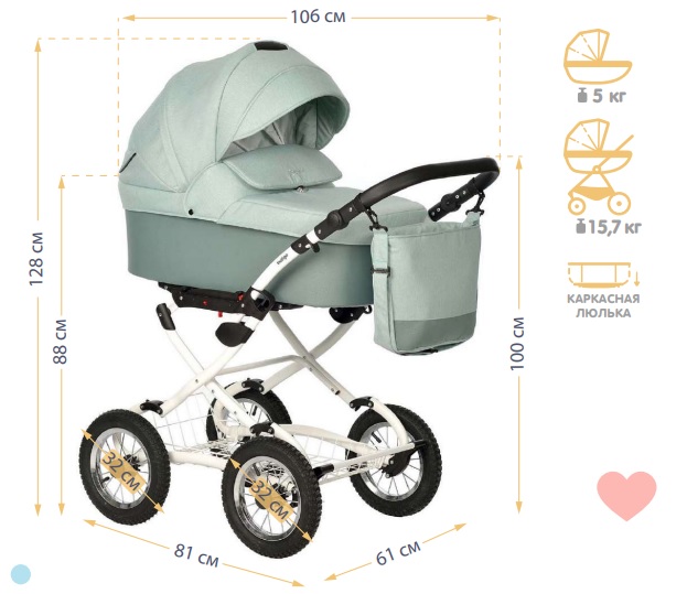 - Вес (кг):каркас рамы - 7,2 кг; колеса - 3,5 кг, люлька - 5 кг, прогулочный блок - 5,5 кг