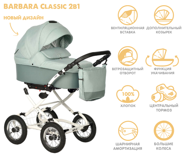 Коляска Indigo BARBARA Classic 2 в 1 (Индиго Барбара Классик) - практичная классическая коляска на больших надувных колесах - это воплощение надежности и устойчивости. Надувные колеса и шарнирные амортизаторы обеспечат отличную проходимость модели и плавный мягкий ход. Такая коляска прекрасно справится с сугробами, песком или гравием. Металлическая корзина с бортиками позволит взять на прогулку большое количество необходимых вещей, и обеспечит удобный доступ к ним.