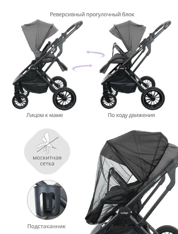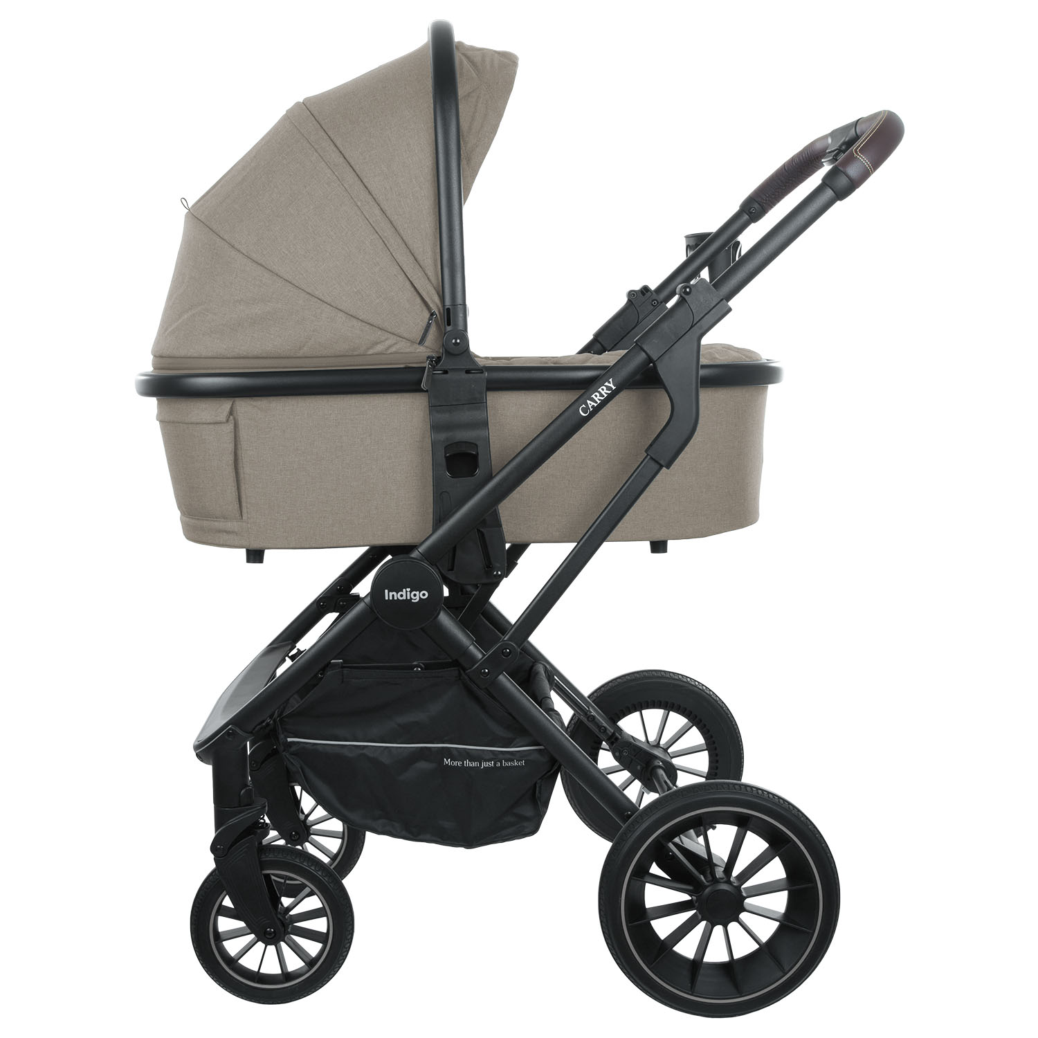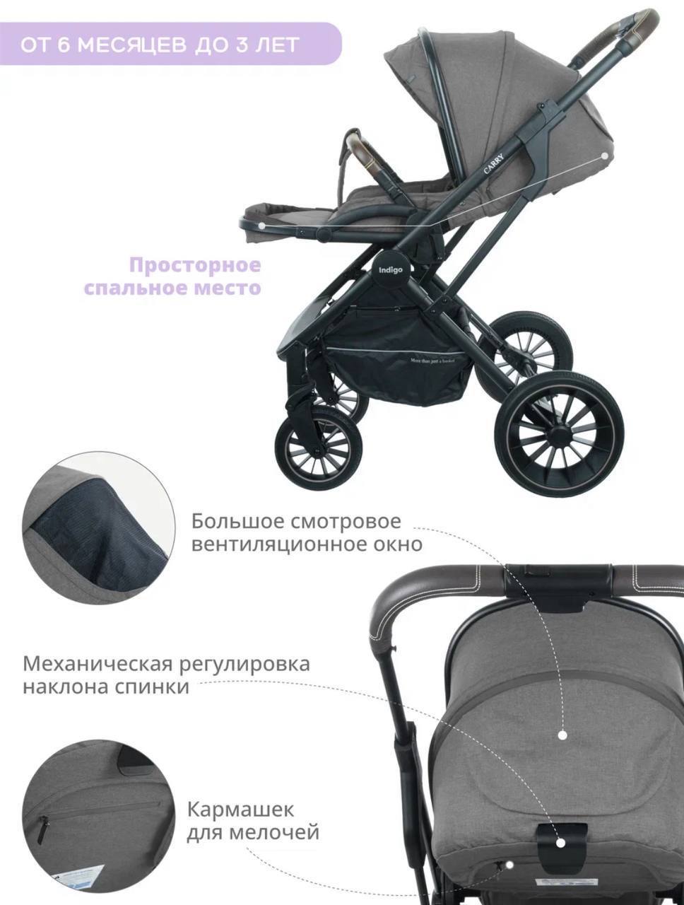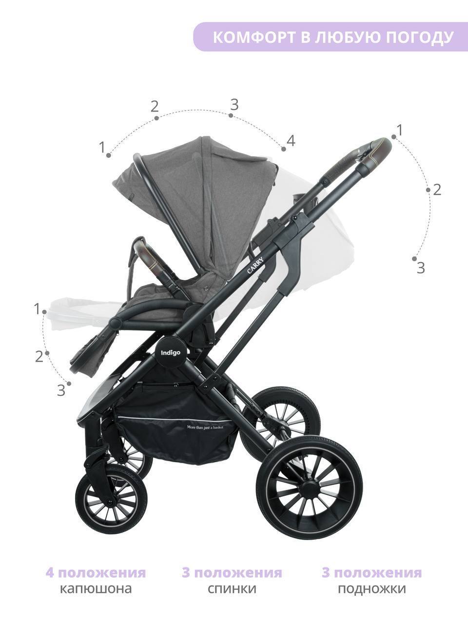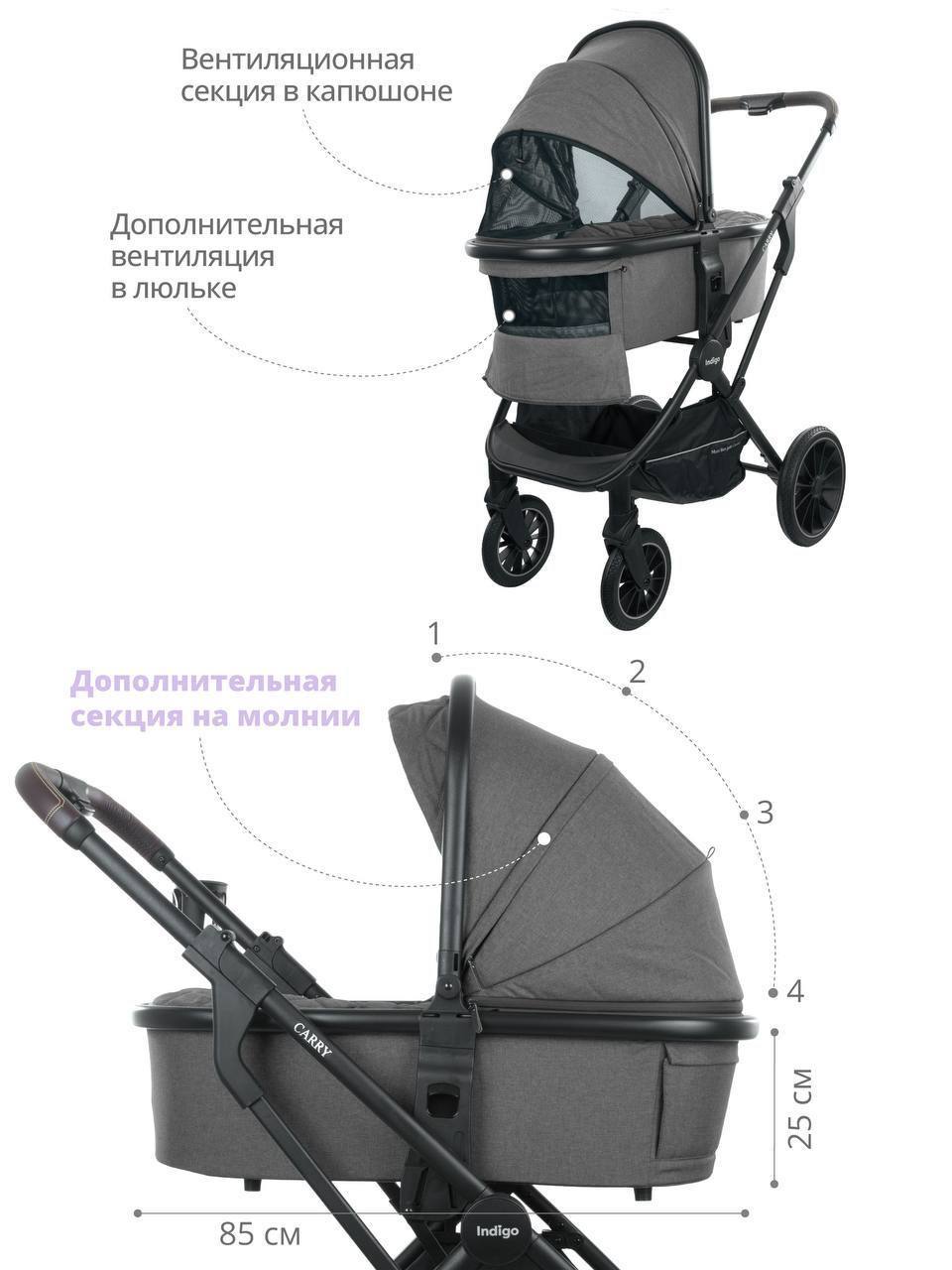 Коляска Indigo CARRY 2 в 1 (Индиго кери) - стильная коляска, которая сочетает в себе легкий вес, большой функционал и высокое качество исполнения. Эта коляска обеспечит максимальный комфорт и безопасность ребенка с рождения до 3 лет. Indigo CARRY прекрасно подойдет для любителей долгих прогулок. Коляска оснащена амортизаторами на передних и задних колесах, которые обеспечивают мягкий ход даже на дорогах с неровностями. Ваш малыш будет чувствовать себя комфортно на все 100%! Передние поворотные колеса вращаются на 360° и позволяют увеличить маневренность, при необходимости их можно заблокировать для прямолинейного хода. Люлька и прогулочный блок выполнены в оптимальных размерах, поэтому ребенок будет чувствовать себя комфортно даже в объемной зимней одежде.