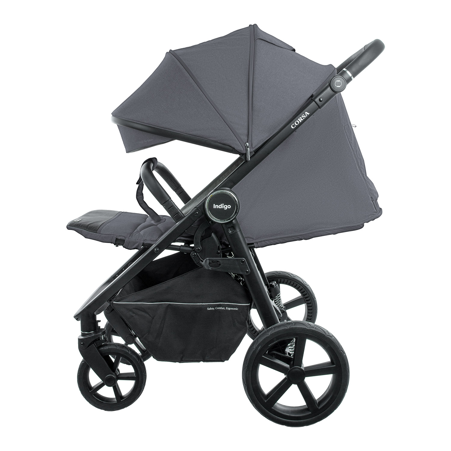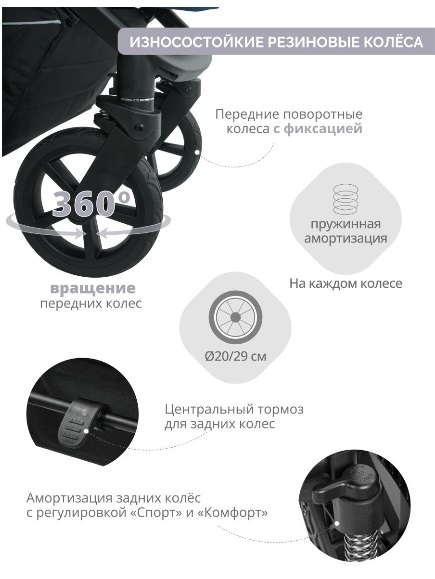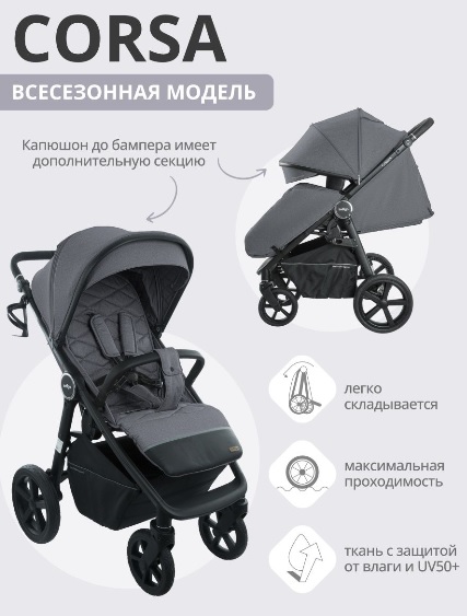CORSA оснащена большими резиновыми колесами. Они не сдуваются, не прокалываются, и отлично справляются с неровностями на дороге. Дополнительно коляска оснащена регулируемой амортизацией. В зависимости от веса ребенка и ваших предпочтений можно регулировать ход коляски от мягкого до более жесткого. В сочетании с регулируемой по высоте ручкой и передними поворотными колесами коляска легко управляется и отлично маневрирует на дороге. Вместительная корзина для покупок установлена высоко от дороги, не мешая во время ходьбы. Коляска снабжена всеми необходимыми аксессуарами, что позволит сразу после покупки отправиться на прогулку.