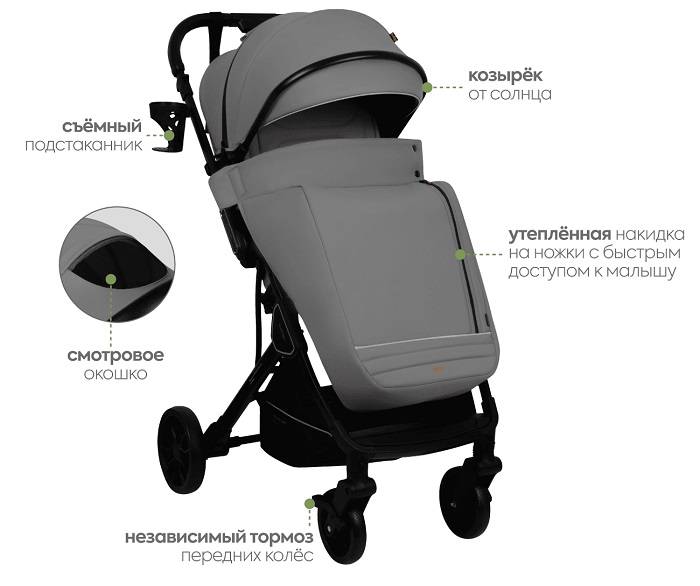 Капюшон регулируется в четырех положениях и дополнен секцией на молнии, вентиляционным окном и смотровым окошком с москитной сеткой на магнитах. Для прогулок в прохладную погоду предусмотрена накидка с удобным доступом к ребенку на молнии. Все текстильные элементы продуманы для комфортного использования в любое время года.