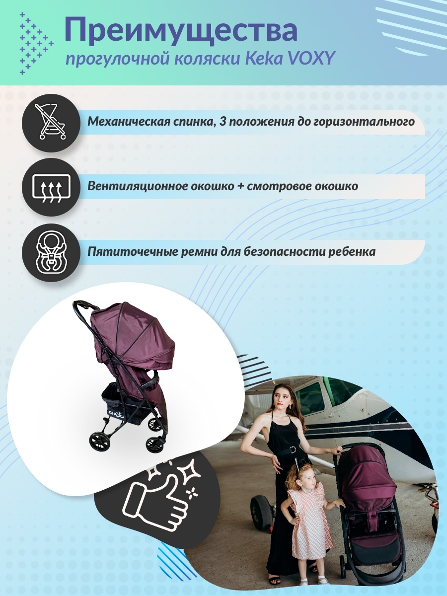 Коляска Keka Voxy ( Кека Вокси) - красивая и очень практичная коляска для летних, и не только, прогулок с ребенком от 6 месяцев. Яркие расцветки обязательно понравятся молодой маме и ребенку. Большой функционал коляски обеспечит ребенку самое комфортное спальное место, удобную транспортировку коляски и приятное управление по любым дорогам. Большой капюшон с защитой от УФ лучей и осадков закроет ребенка практически до бампера. Коляска складывается одной рукой, что очень удобна в поездках. Спинка механическая, что очень удобно.