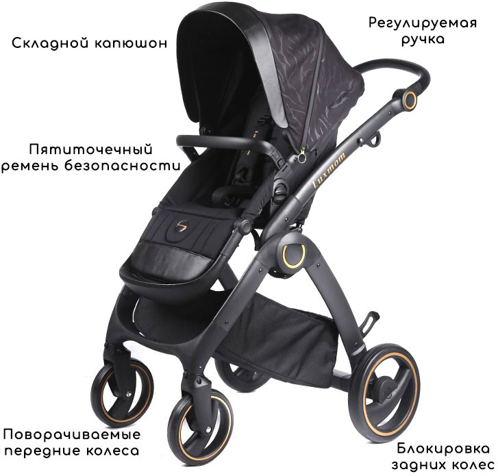 В комплекте: коляска прогулочная, съемная детская люлька, чехол для ног, корзина для багажа