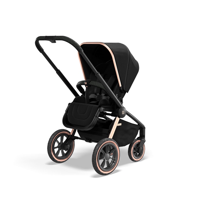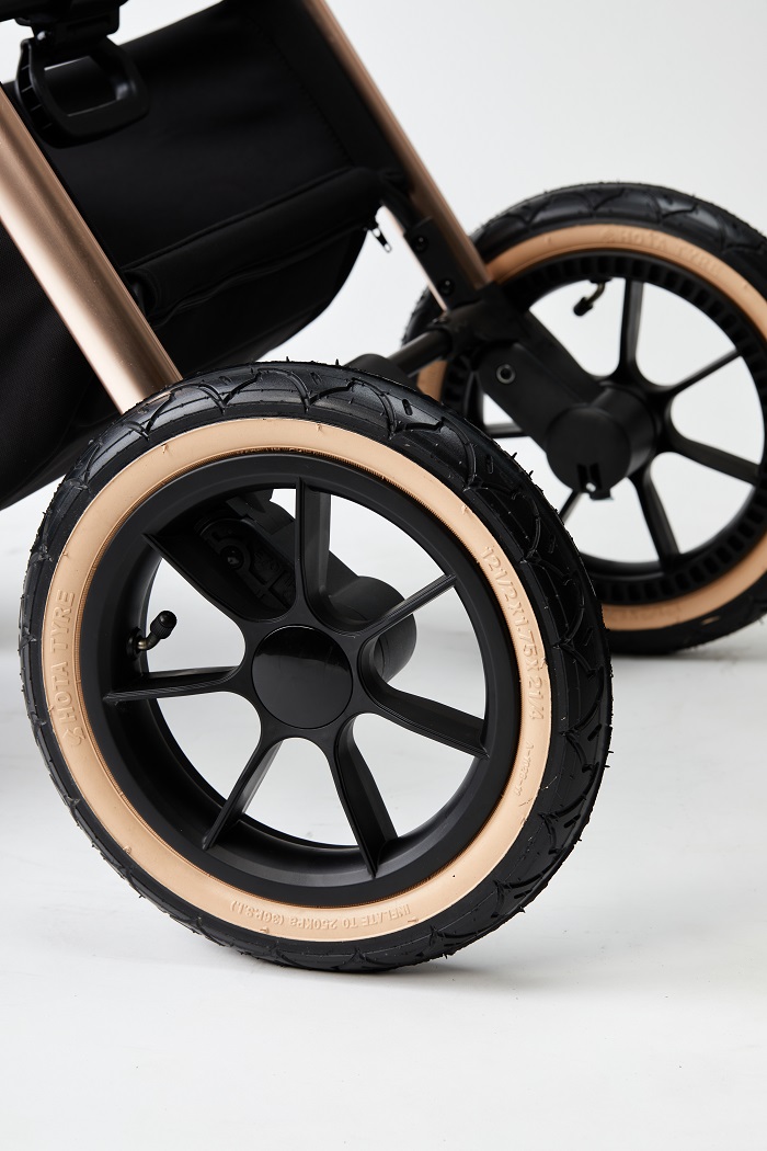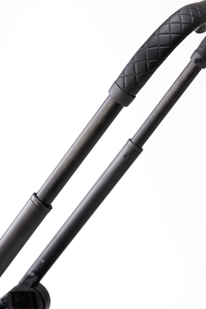 Модель выполнена в качественном текстиле. Это современный материал, который не продувается, имеет защиту от УФ лучей 50+ и водоотталкивающую пропитку. Коляска имеет фирменные значки, которые подчеркивают элегантность и премиальность модели. Особый шарм коляске придает родительская ручка, выполненная из качественной структурированной эко кожи. Ручка очень приятна на ощупь, и дарит только положительные эмоции от управления таким транспортом.