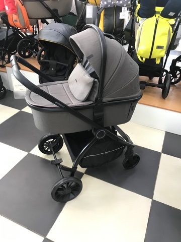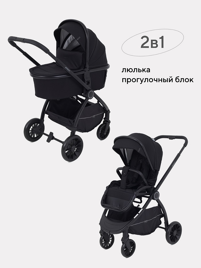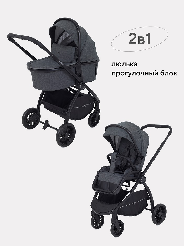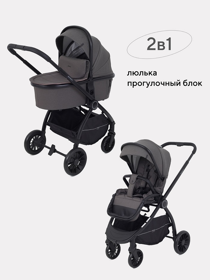 Коляска состоит из легкой алюминиевой рамы, люльки и прогулочного блока. Люлька компактно складывается отдельно. Рама и прогулочный блок могут складываться вместе или, для более компактного хранения, по отдельности.