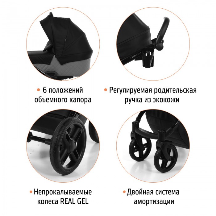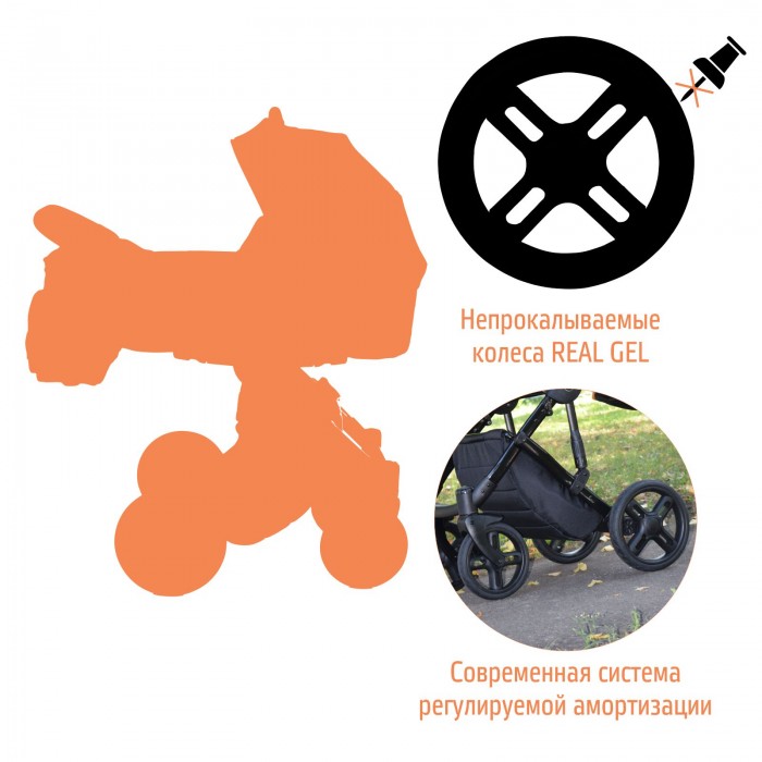 Алюминиевая рама обеспечит коляске надежность и долговечность. Она складывается компактно книжкой и удобная для хранения и транспортировки. Большим преимуществом коляски являются гелевые колеса REAL GEL и двойная амортизация. Такое сочетание превращается коляску в настоящий внедорожник, который проедет по любым дорогам и бездорожью, бережно охраняя сон ребенка. Такие колеса не прокалываются, не сдуваются, обеспечивая мягкий и плавный ход транспорта. Многие клиенты отмечают, что коляска отлично справляются с любыми сугробами, грязью. Все технологические соединения ходовой части скрыты под защитными колпачками, что убережет /коляску от дополнительного облуживания. Большая корзина, которая полностью закрывается, надежно закроет вещи и покупки от грязи и пыли.