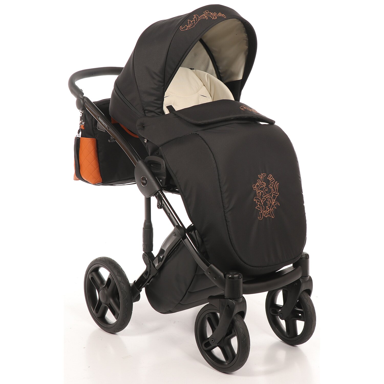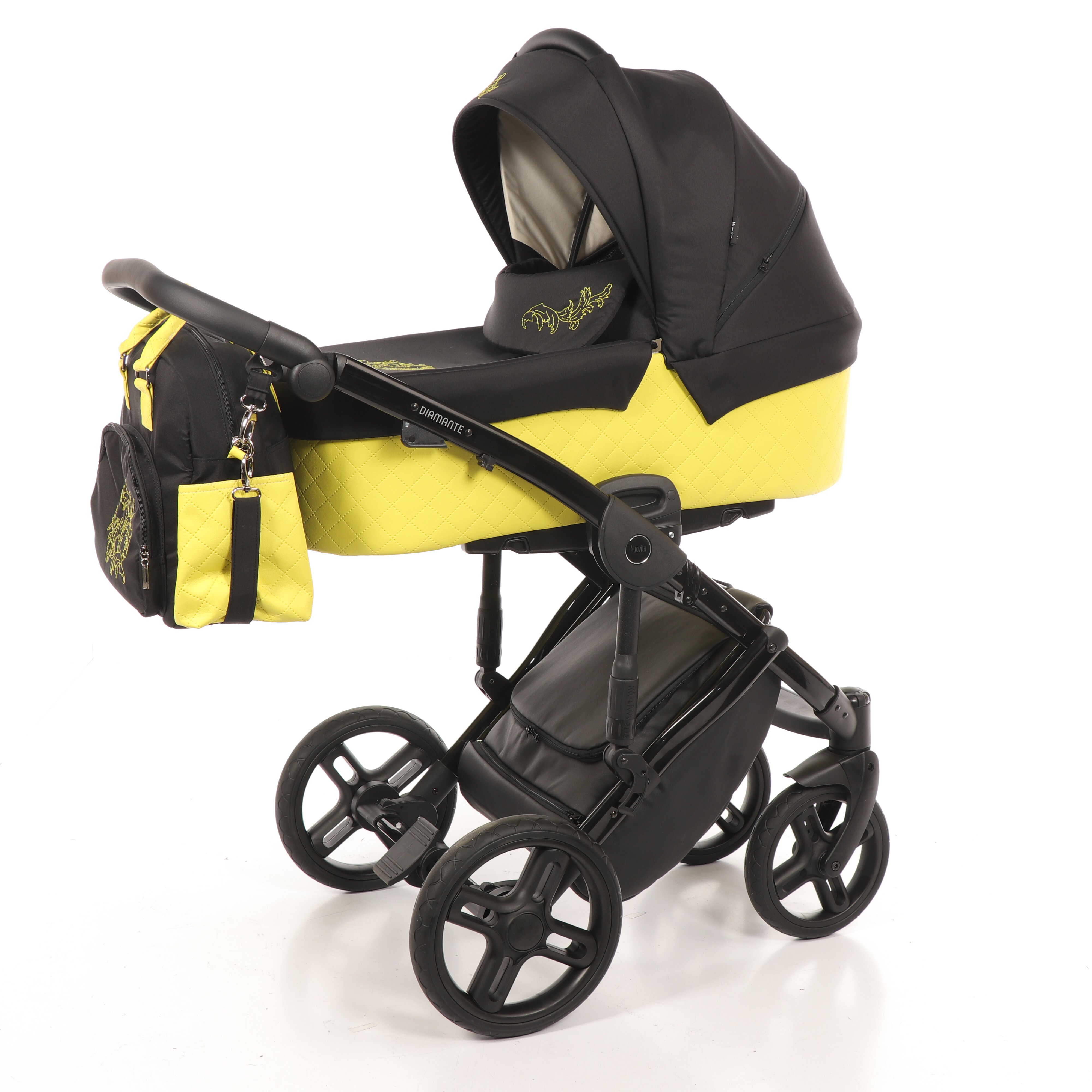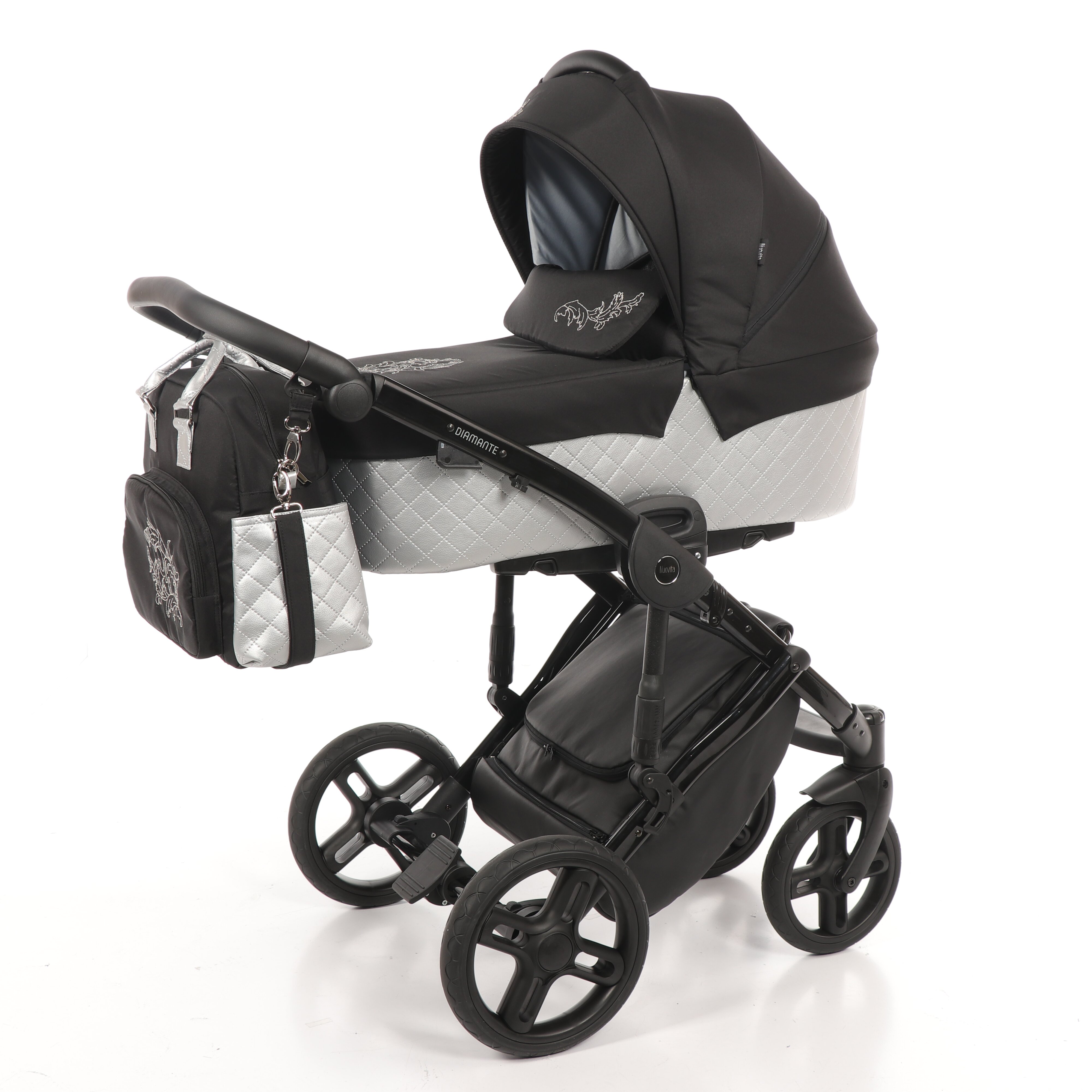 Коляска Nuovita Diamante 2 в 1 (нуовита диаманте) - элегантная всесезонная коляска для ребенка с рождения до 3 лет. Коляска отличается непревзойденным дизайном с нежным узором на капюшоне и накидке на ножки. Высокое качество коляски удивит вас и подарит ребенку максимальный комфорт и безопасность. Коляска выполнена из эко-кожи и текстиля, рама сделана из алюминия и покрыта порошковой краской. Модель представлена как в очень ярких расцветках, которые будут заметны на улице и привлекут внимание прохожих, так и в спокойных цветах, которые подчеркнут изысканность модели. Огромная комплектация позволит гулять в любую погоду: дождевик, теплая накидка на ноги, красивая вместительная сумка, москитная сетка, подстаканник.