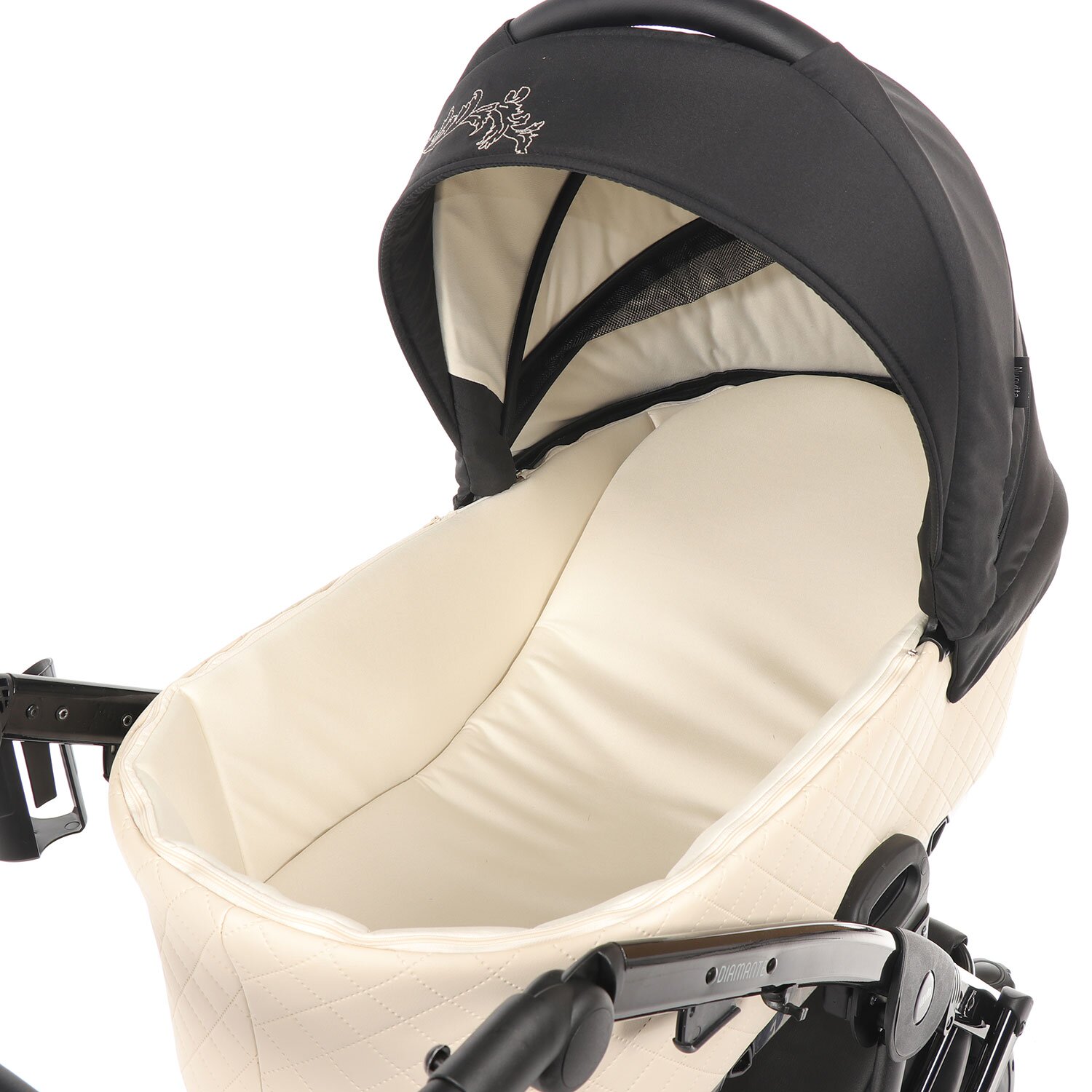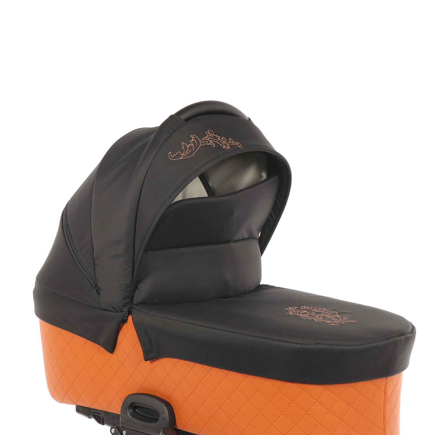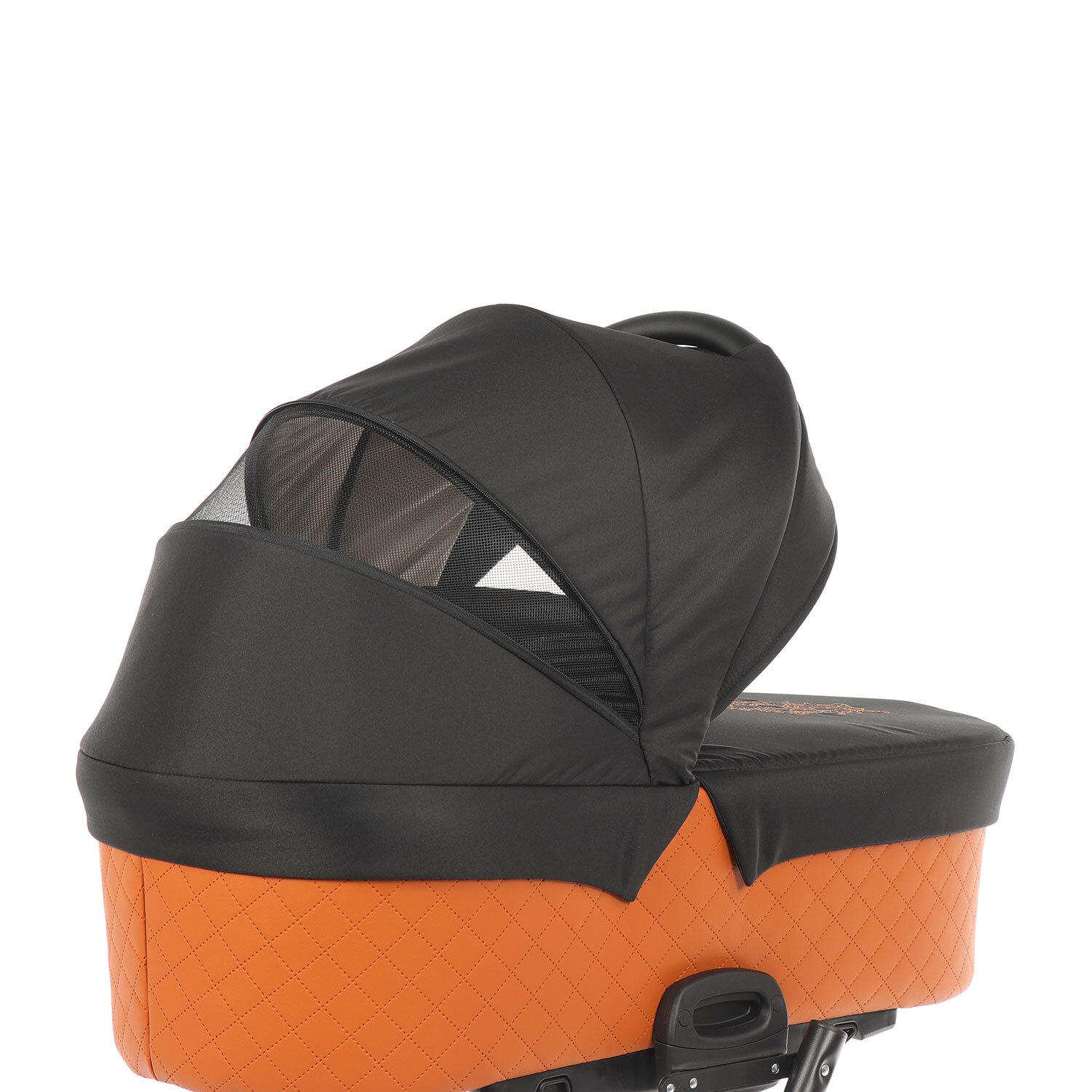 У коляски большая люлька 80/33/20см, в ней можно с комфортом устроить малыша, одетого в теплый комбинезон или в зимний конверт. Закрывает люльку чехол с высоким отворотом. Размер капора регулируется в 6 положениях; за счет скрытого сегмента, выполненного из сетки, обеспечивается проветривание внутреннего пространства в жаркую погоду. Изголовье люльки регулируется в 4 положениях. Фиксация на шасси производится легко и быстро при помощи системы ONE KLICK. При установке на пол люльку можно использовать для укачивания благодаря встроенным в дно полозьям. В капоре размещена ручка для переноски.