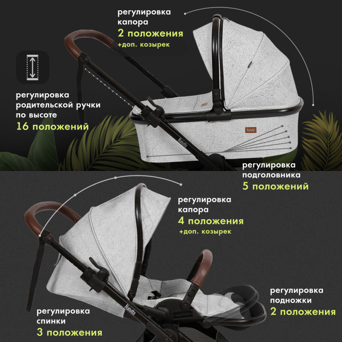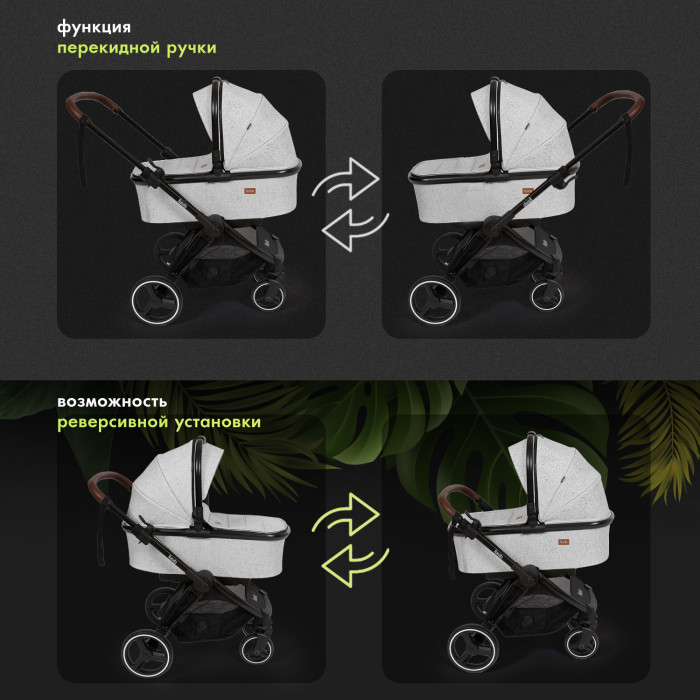 Каждый элемент коляски продуман, что бы вам было удобно, а ребенку комфортно и безопасно. Это и современные качественные материалы, и весь необходимый функционал для комфортной прогулки (регулировка подголовника в люльке, ручка для переноски люльки, реверсивный прогулочный блок, полностью раскладывающееся сидение для сна в прогулочной коляске и тд).