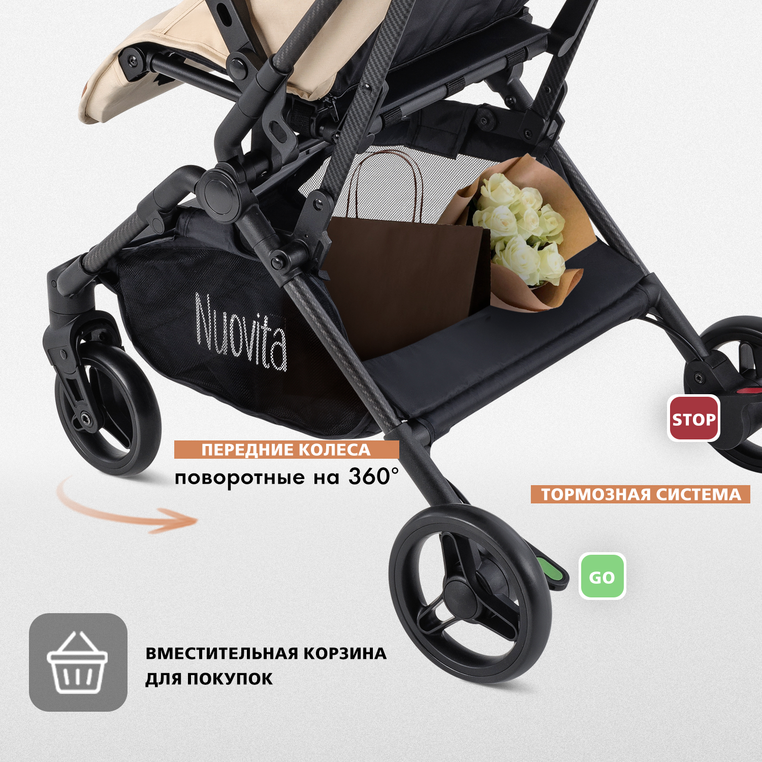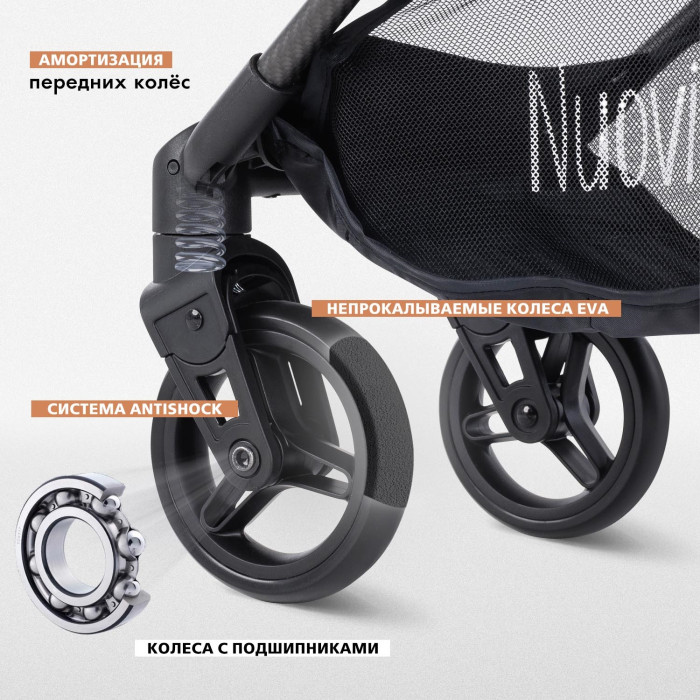 Благодаря прочной конструкции из карбона (а он гораздо прочнее и легче стали!) и надежному шасси детская коляска Nuovita Note может использоваться как всесезонная и универсальная коляска.