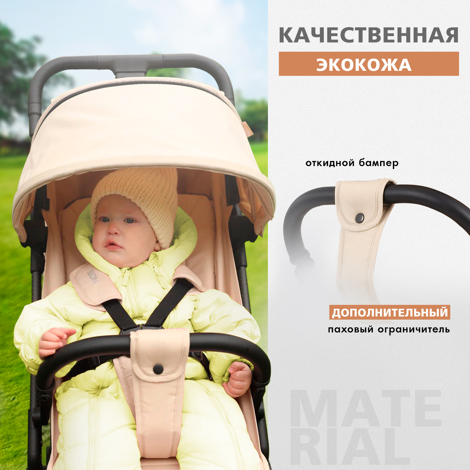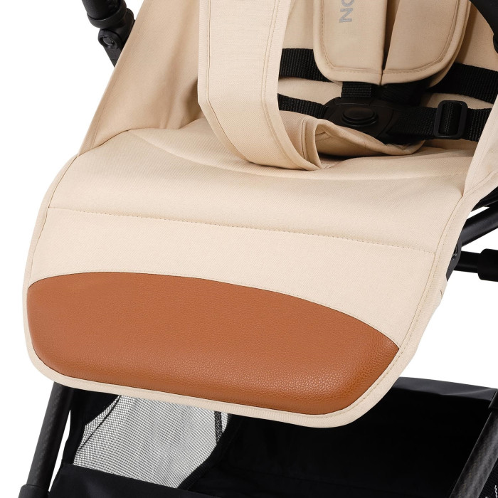 Тканевые элементы коляски изготовлены из тактильно приятного инновационного материала катионика: он не вытягивается, не деформируется и сохраняет стойкость цвета. Все материалы изделия отличаются прочностью, практичностью в уходе и долговечностью.