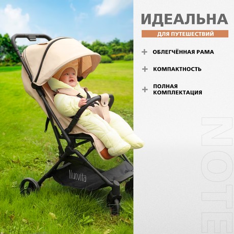 Коляска Nuovita Note (Нуовита нот) - невероятно легкая и компактная коляска на надежной карбоновой раме. Вес данной модели всего 5,9 кг, при этом коляска имеет комфортное спальное место с регулируемой спинкой и очень удобное, компактное сложение. Коляска отлично подойдет для летних или осенних прогулок, увлекательных путешествий, поездок за город. Складная конструкция позволяют брать её в машину: она без труда в сложенном виде поместится в багажник даже самого компактного автомобиля, а механизм складывания настолько понятен и прост, что её легко сложить в считанные секунды.