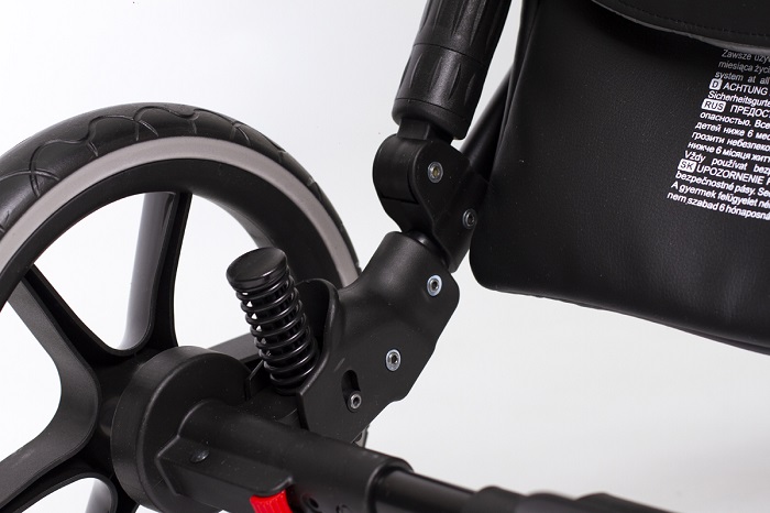 - Инновационная система амортизации с широким диапазоном регулировки жесткости (на каждом колесе+2 на раме), и возможностью блокировки амортизаторов на раме (полезно при весе ребенка выше 12 кг)