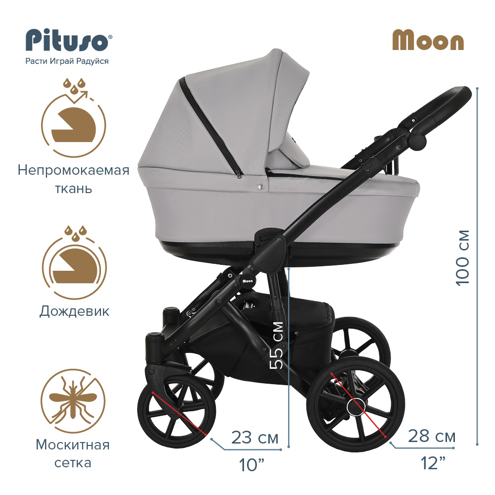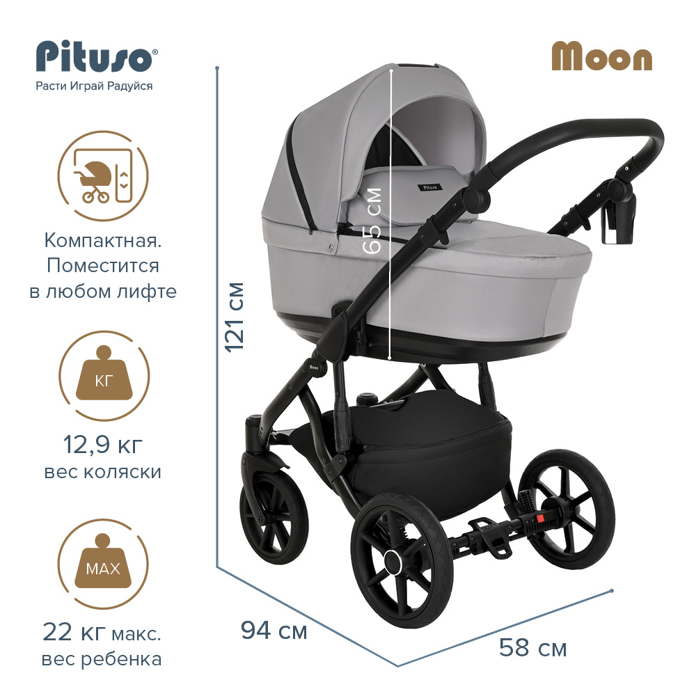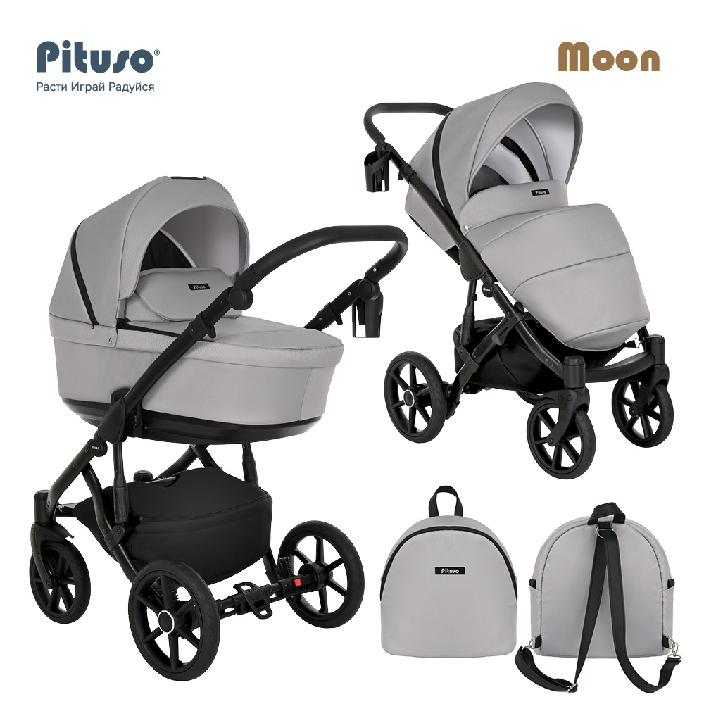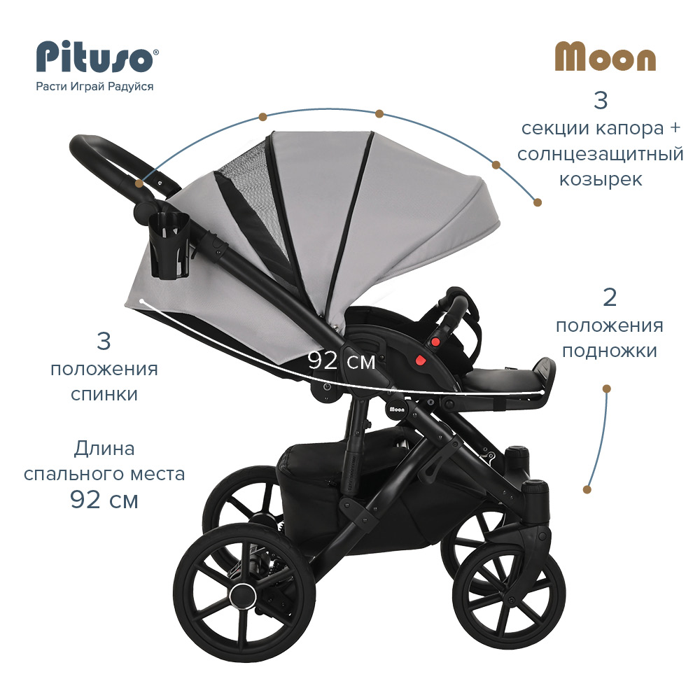 PITUSO MOON 2 в 1 (Питусо Мун) - новая облегченная люлька из инновационного композитного материала, который обеспечивает отличную термо- и звукоизоляцию, и при этом обладает весом 4,6 кг. Прогулочный блок коляски MOON имеет удлиненную подножку, увеличенный капюшон. Неоспоримым преимуществом данной модели коляски является возможность раму (шасси) коляски сложить вместе с прогулочным блоком, что облегчает транспортировку.
