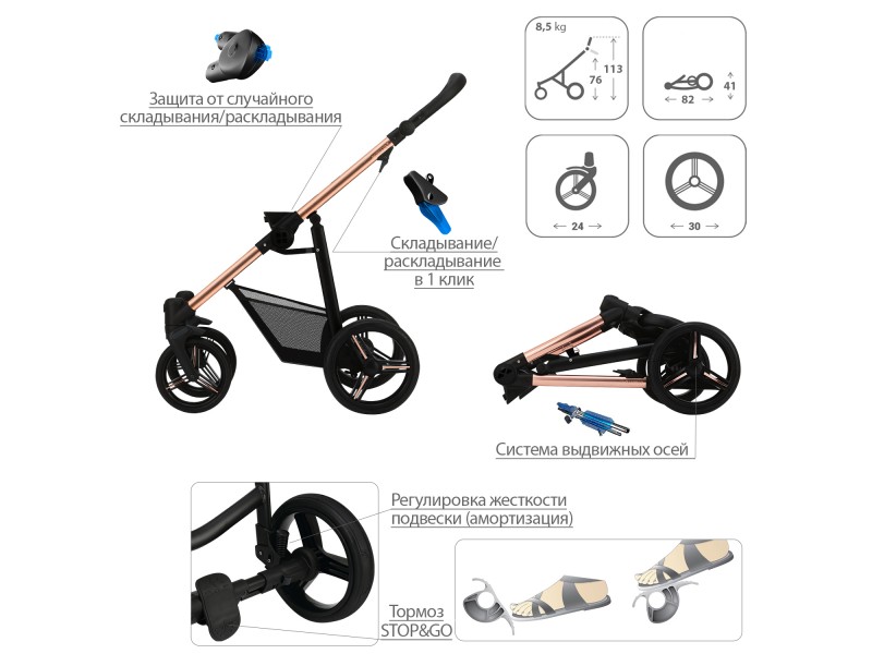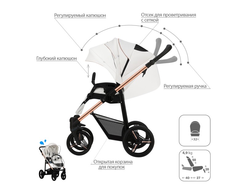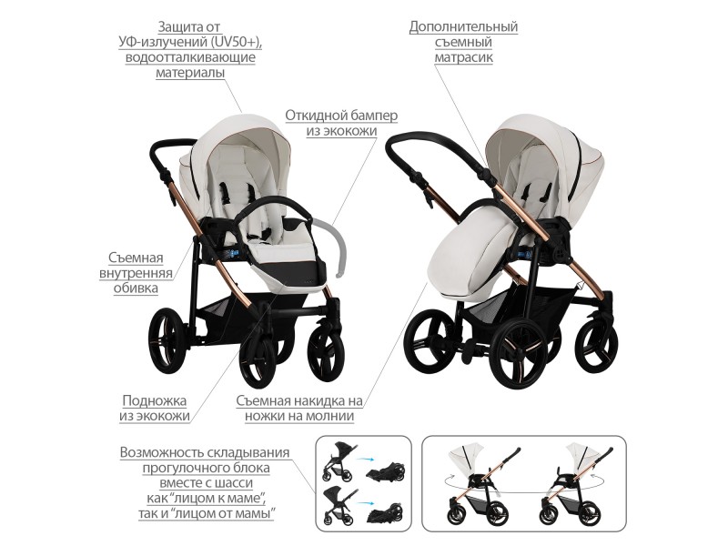 - Обивка коляски: водоотталкивающая, съемная, с УФ-защитой 50+.