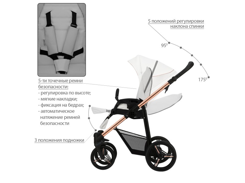- Регулируемые 5-точечные ремни безопасности с мягкими накладками на плечи.