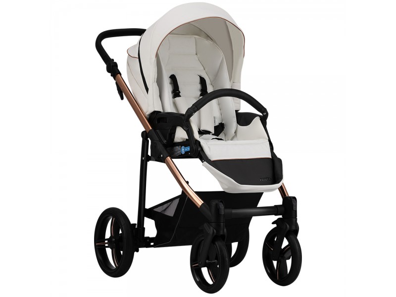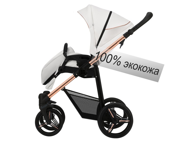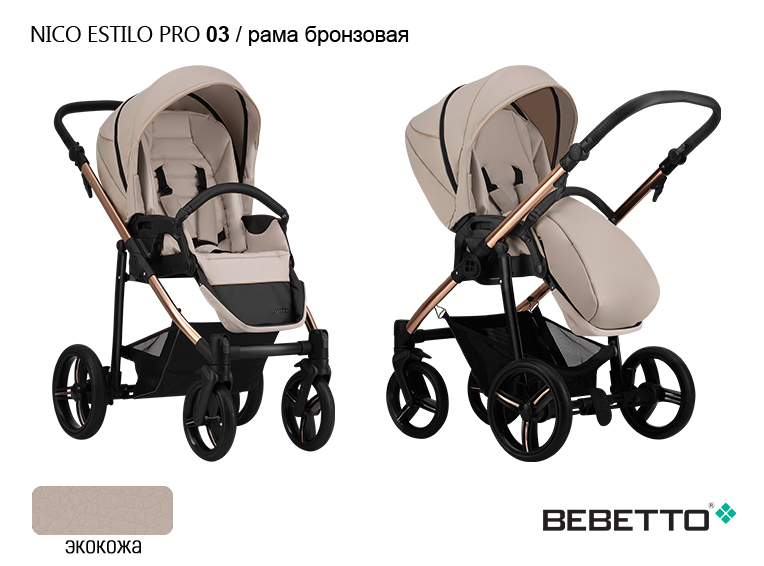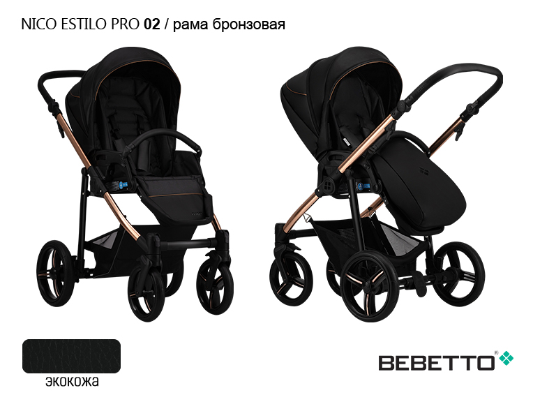 Коляска Bebetto Nico ESTILO PRO (Бебетто Нико Эстило про) - красивая и стильная прогулочная коляска для ребенка от 6 месяцев с реверсивным сидением. Главная особенность коляски - обивка выполнена из 100% качественной эко кожи, а рама коляски из облегченного алюминия выполнена в бронзовом цвете. Коляска смотрится ярко и эффектно. Но, у коляски не только прекрасный дизайн, но и огромный функционал. Возможность устанавливать сидение по ходу и против хода движения позволит родителям самим выбирать, как возить ребенка ведь все дети разные, и кто-то готов ездить и не видеть родителей, а кто-то нет. Так же возможность возить ребенка против хода движения рекомендована для детей до года. У коляски очень комфортное сидение с жесткой спинкой, которая регулируется с помощью кнопки в четких положениях. Почти горизонтальный наклон спинки в 175 градусов и поднятая подножка образуют очень комфортное место для сна 97 см в длину. Коляска отлично защищает ребенка со всех сторон и хорошо подойдет как зимний вариант коляски. Для лета в коляске предусмотрены вентиляционные секции и комфортная внутренняя обивка.