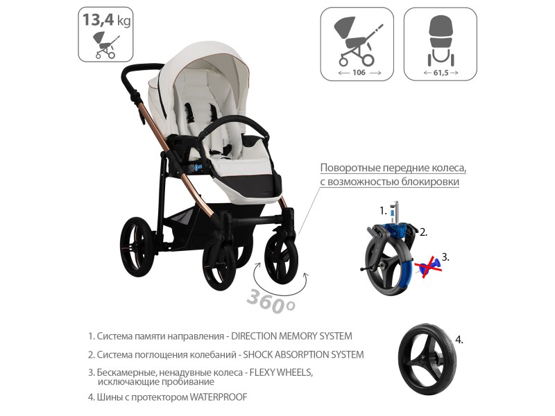 Колеса выполнены из современных материалов, они резиновые, но не прокалываются, не сдуваются и простые в обслуживании. Продуманная амортизация и специальные системы гарантируют мягкий и плавный ход коляски по любым дорогам и бездорожью. Коляска складывается книжкой, вместе с сидением, установленным в любом направлении.