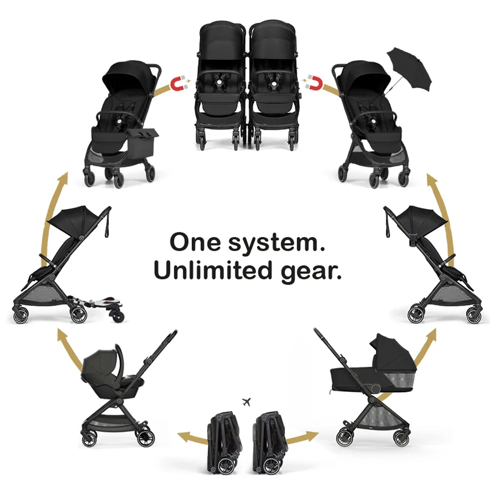 - Коляска с магнитной системой блокировки, которая автоматически соединяет аксессуары (или даже две коляски) всего за секунду