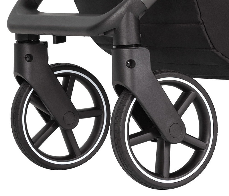 Коляска оснащена большими резиновыми ненадувными колесами с высоким профилем. Они не сдуваются и требуют дополнительного сервисного обслуживания. Каждое колеса оснащено амортизацией, в задней части коляски предусмотрено переключение жесткости хода. Коляска уверенно пройдет по бездорожью, проедет по снегу, песку. Передние колеса с автоматической фиксации в положении "прямо", фиксируются флажком под подножкой.