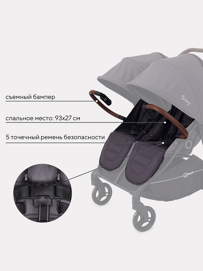 Коляска Rant Twinny для двойни (Рант Твинни) - красивая и функциональная коляска для двоих детей: двойняшек или погодок от 6 месяцев. Несмотря на то, что коляска рассчитана для двоих детей она не смотрится массивно, очень компактная и весит всего 14 кг. Главное ее преимущество - это очень комфортные сидения с индивидуальными настройками спинки и подножки. Качественная, приятная на ощупь ткань внутри коляски и водонепроницаемая и ветрозащитная обивка снаружи. Удобные ремешки безопасности имеют регулировку по высоте и ширине. У каждого ребенка будет свой бампер-ограничитель, выполненный из качественной эко кожи. Коляска оснащена большими капюшонами-батискафами, которые практически полностью закрывают детей от любой непогоды, при этом есть удобные смотровые окошки для мамы.