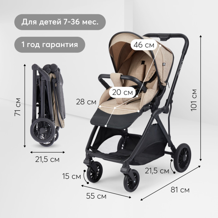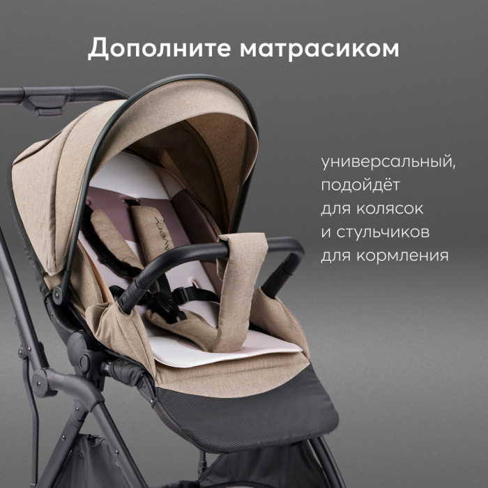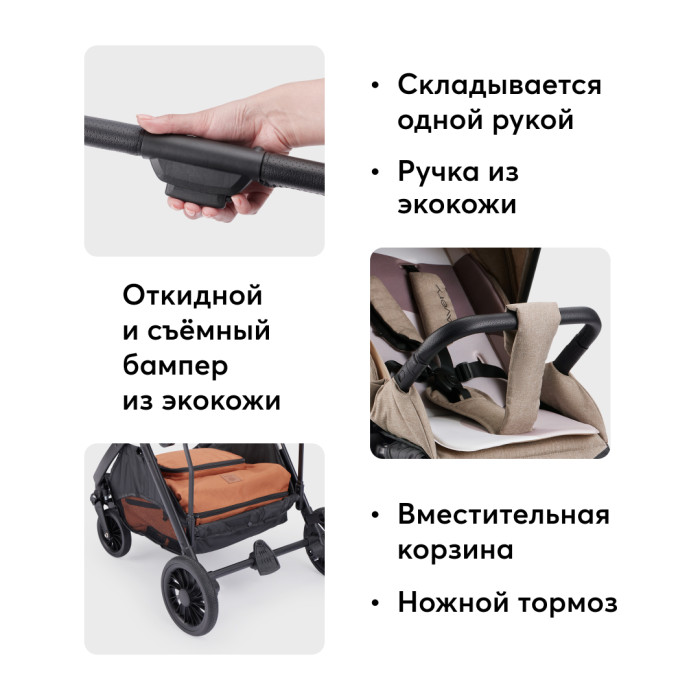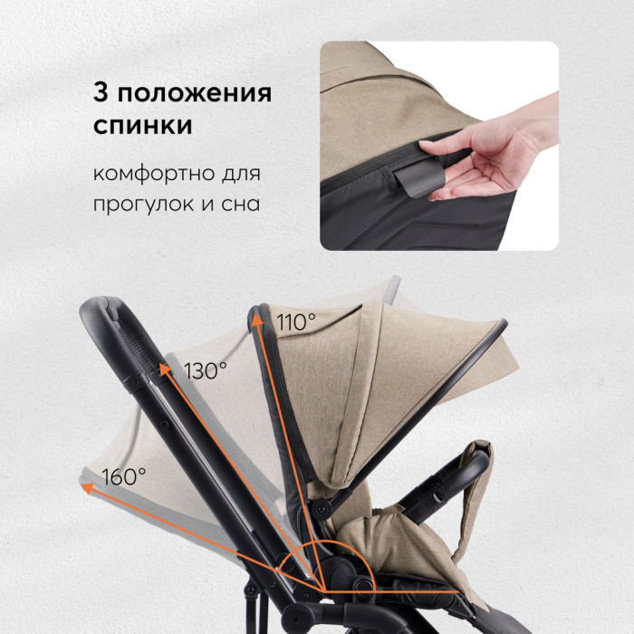 Сидение коляски имеет несколько вариантов наклона спинки, от сидячего до почти горизонтального положения, что позволит катать в коляске ребенка, который еще не сидит самостоятельно, и позволяет полноценно спать во время прогулки. Подножка поднимается, увеличивая спальное место для малыша. Большой капюшон уверенно закрывает ребенка от непогоды, яркого солнца. За безопасность малыша отвечают регулируемые по высоте ремни безопасности, ремешок от сползания, съемный бампер.