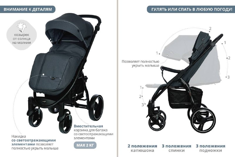 - двойной капюшон регулируется в пяти положениях и опускается до самого бампера+козырек от солнца на молнии;