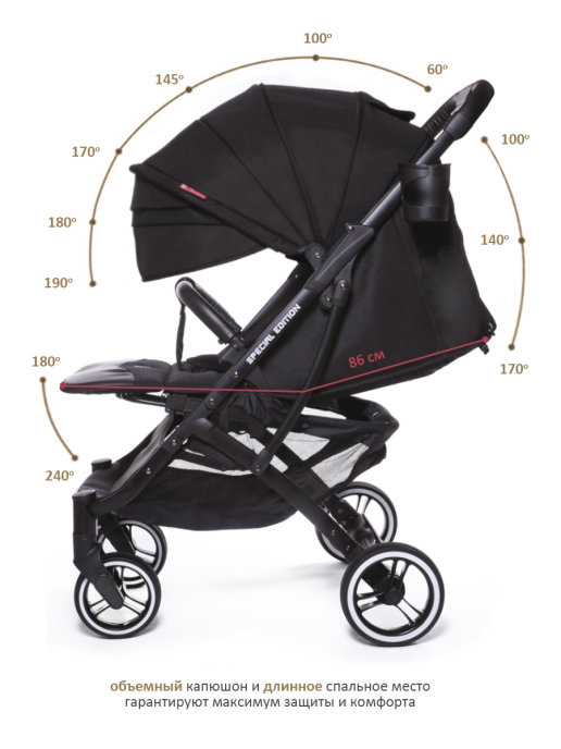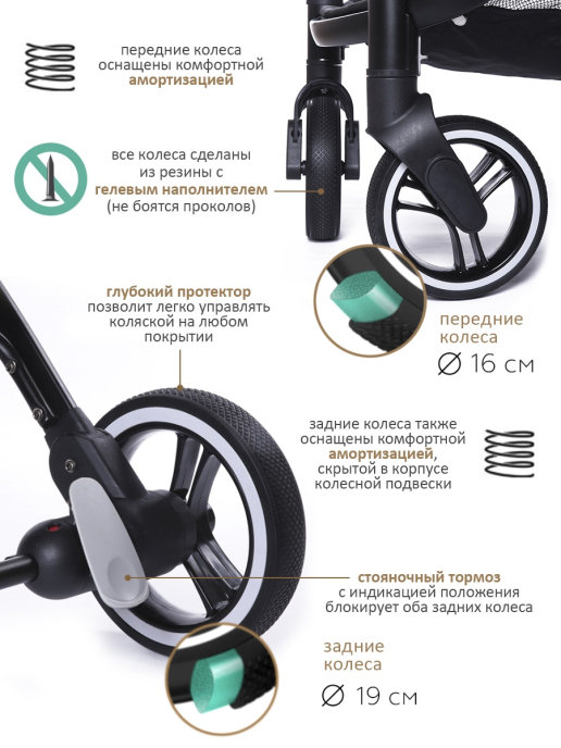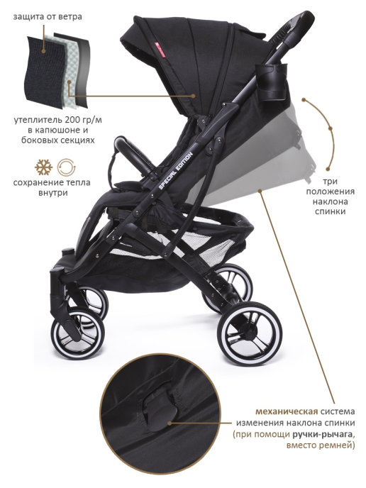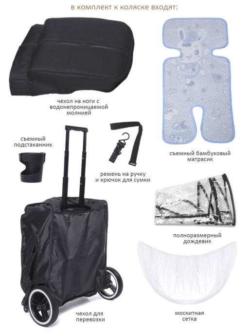 В комплекте: Дождевик, Утепленная накидка на ножки с прорезиновой молнией, препятствует проникновению воды внутрь, во время дождя. Москитная сетка, Подстаканник, Чехол для коляски, Бамбуковый коврик, Корзина с защитной сеткой, Ремешок на руку, Крючок для сумки, Чехол для аксессуаров.