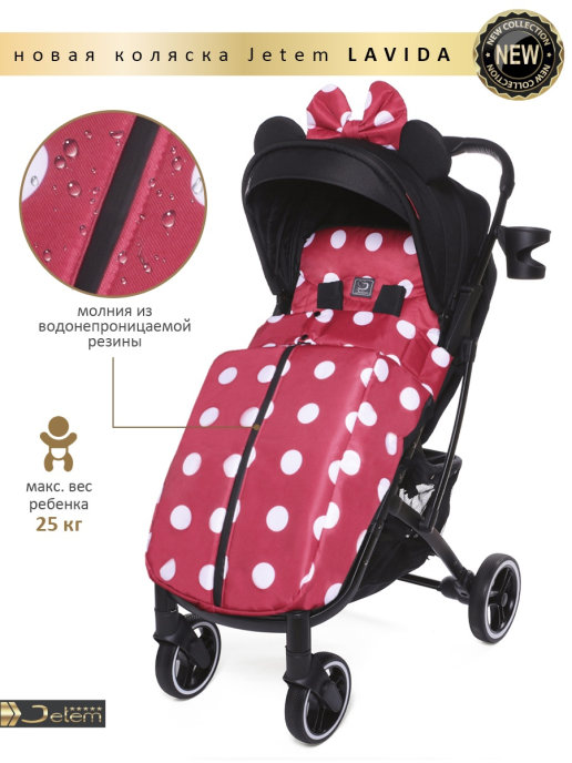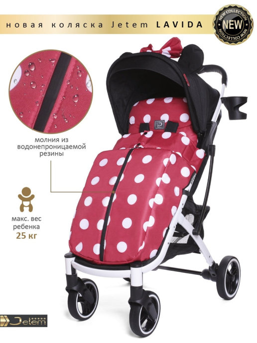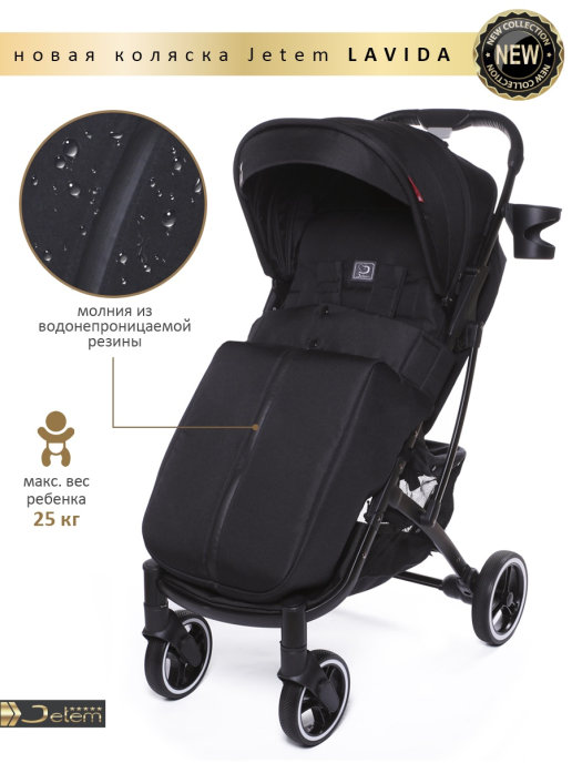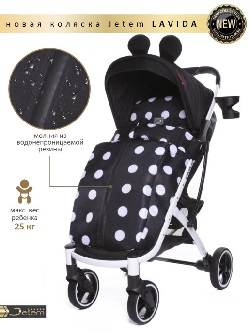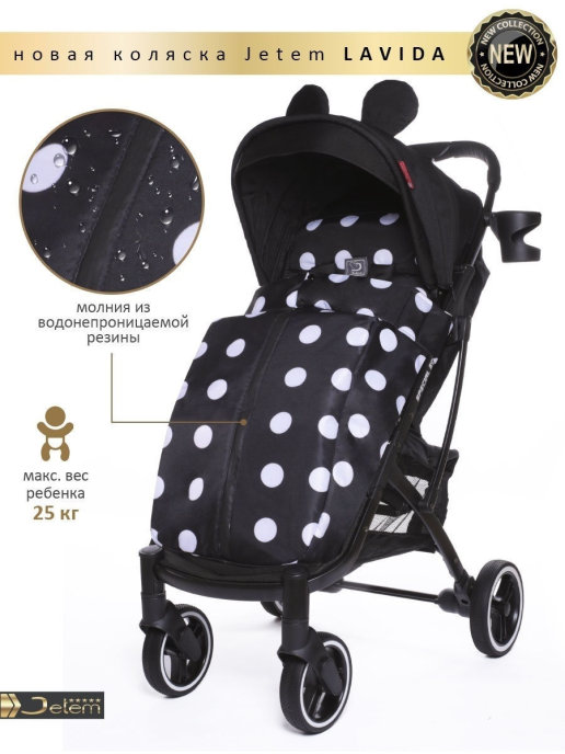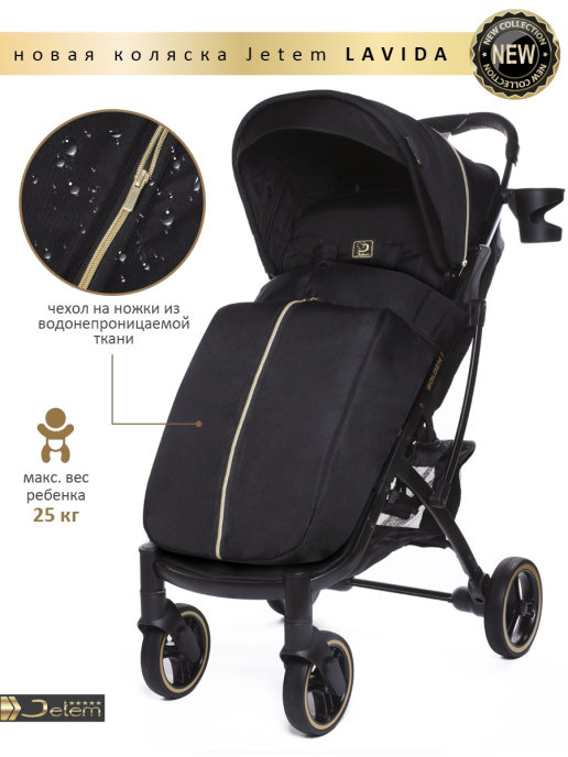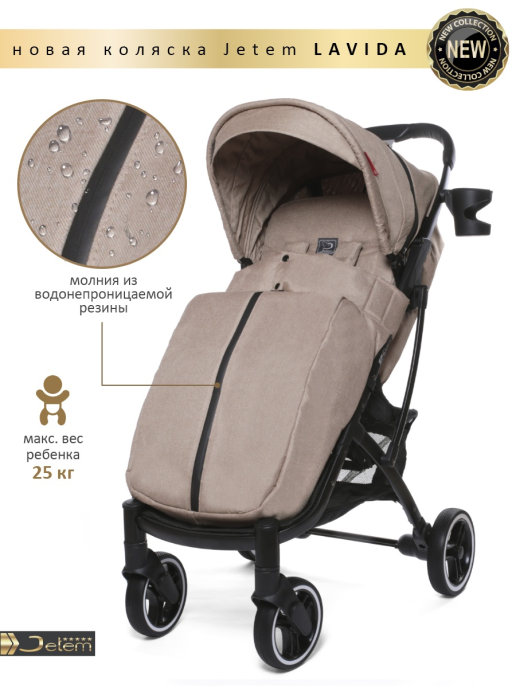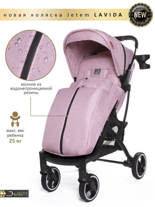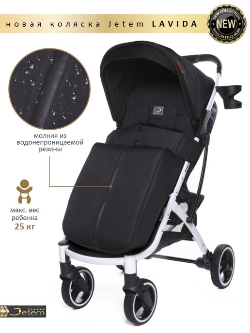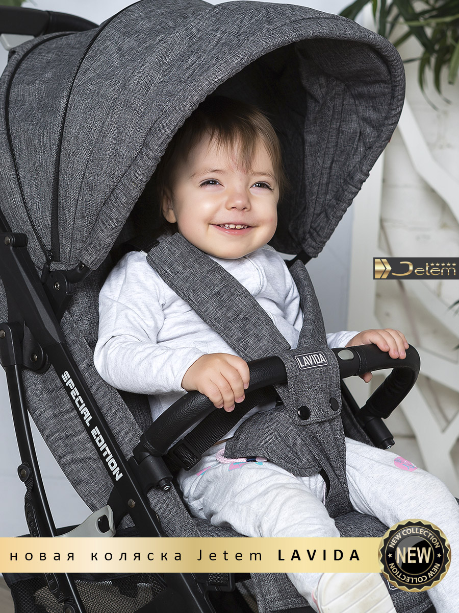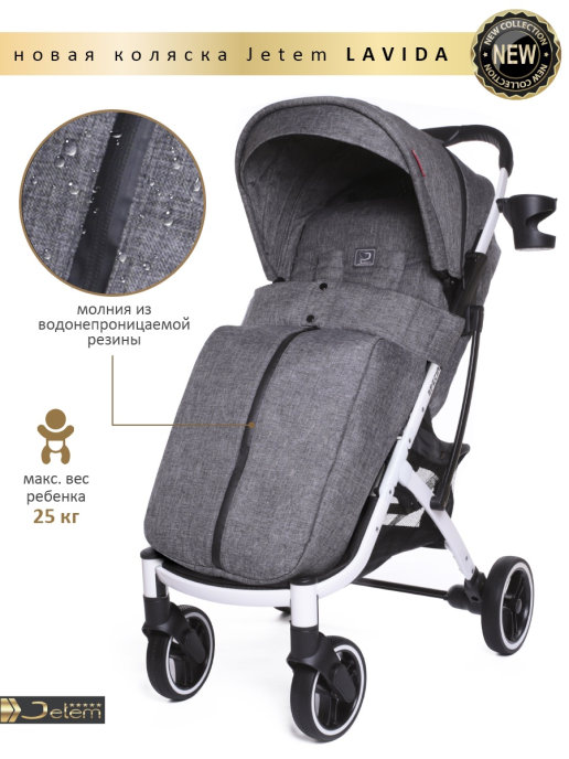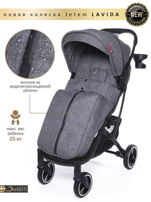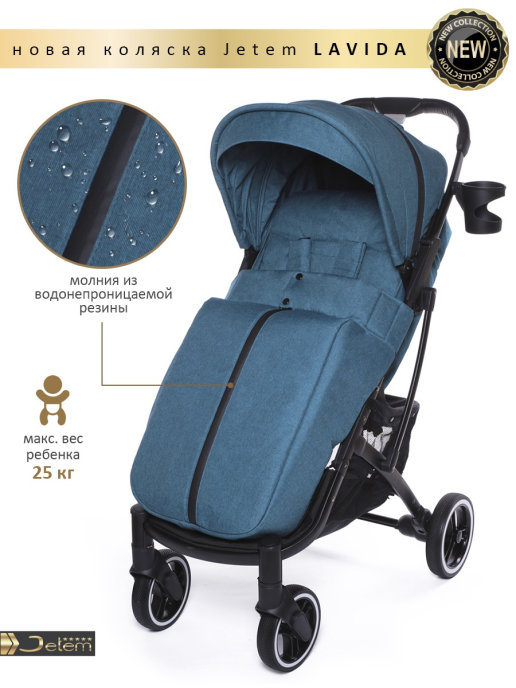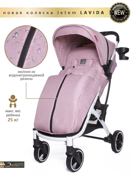 Коляска Jetem Lavida new (Жетем лавида) - ультра лёгкая прогулочная коляска сделана на основе Dearest 818+. У неё усиленная алюминиевая рама, подножка из экокожи. Увеличенные резиновые колеса на подшипниках (12шт), диаметр задних 18 см, передних 15 см, поворотные с автоматической блокировкой, тип колес резина (гелевые), амортизация на передних и задних колесах. Механическая система изменения наклона спинки вместо ременной, опускается до 175 градусов, подходит для новорождённых. Коляска утеплена, и капюшон и бока коляски. Большой капюшон до бампера с козырьком. Плотный (900D) и качественный текстиль, водоотталкивающий для всех расцветок, широкое сиденье. Окно (с молнией) на нижней корзине, есть большой карман. Распашной бампер из экокожи. Механизм складывания, книжка. Коляска складывается чемоданчиком с телескопической ручкой и проходит как ручная кладь в самолёт!