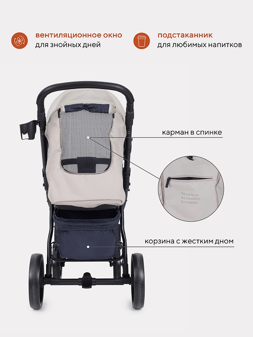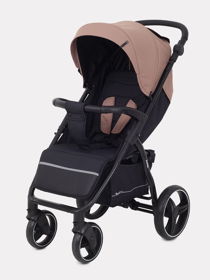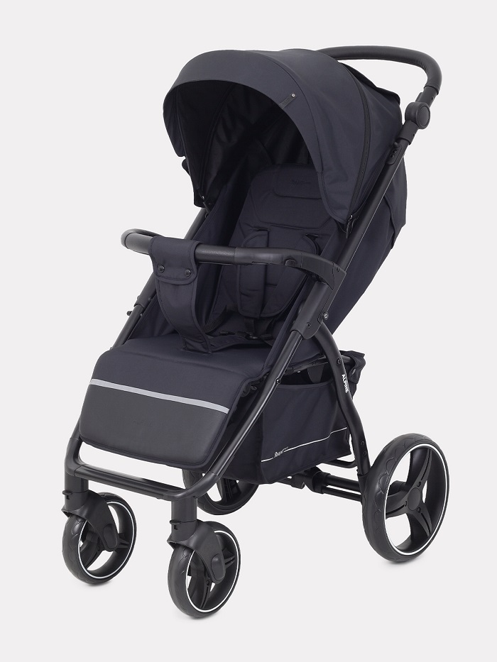 Коляска оснащена большими вездеходными колесами из качественного полиуретана. Они не прокалываются, не сдуваются и очень просты в уходе. Передние колеса оснащены пружинной амортизацией, которая сгладит все неровности дороги. Задние колеса большого диаметра, как в полноценной модульной коляске, преодолеют любое бездорожье. Удобной тормоз педалью оставит обувь родителей чистой. Большая корзина для покупок с жестким дном позволит взять на прогулку любые игрушки и вещи для ребенка.
