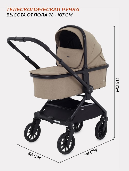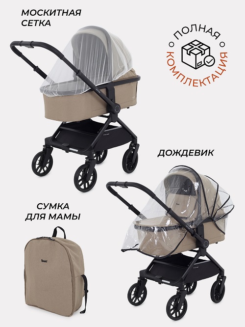 В комплекте: люлька, прогулочный блок, шасси, корзина для покупок, накидка на ножки, сумка для мамы, москитная сетка, дождевик.