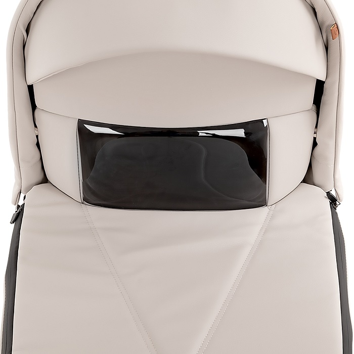 - Капор имеет жёсткое крепление к люльке, на нём находится ручка для переноски люльки, в раскрытом положении он фиксируется, для сложения необходимо нажать кнопки с двух сторон. В капор встроена антимоскитная сетка и дополнительный козырёк для защиты от солнца и дождя.