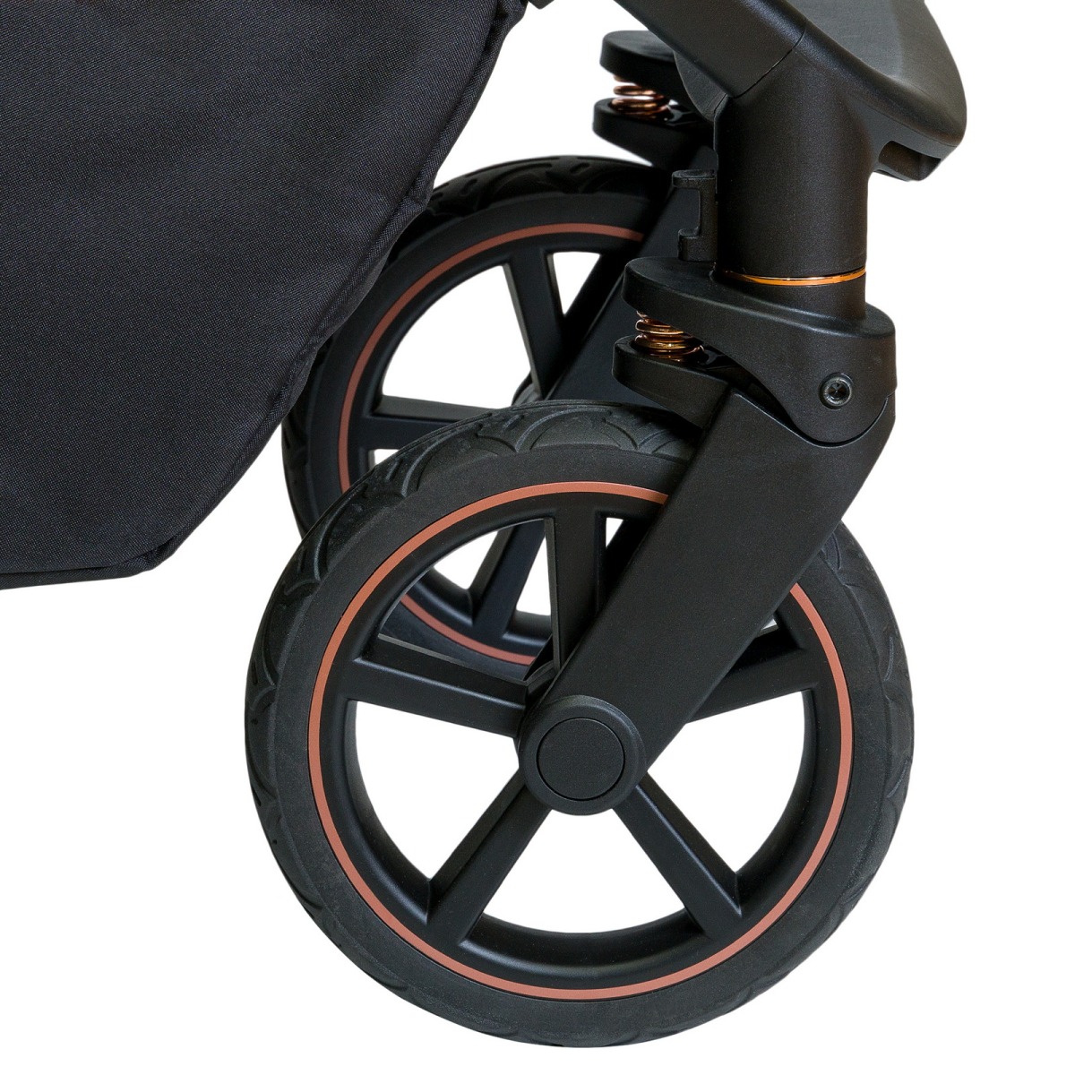 Коляска оснащена современными резиновыми колесами, которые не прокалываются и не сдуваются. Независимая амортизация для всех 4-х колес обеспечит превосходную мягкость и плавность хода. Коляска отлично справится с бездорожьем, снегом, песком. Передние поворотные колеса с возможностью фиксации, для передвижения по бездорожью. Задние колеса увеличенного диаметра имеют регулировку жесткости, для различного типа покрытия дороги.