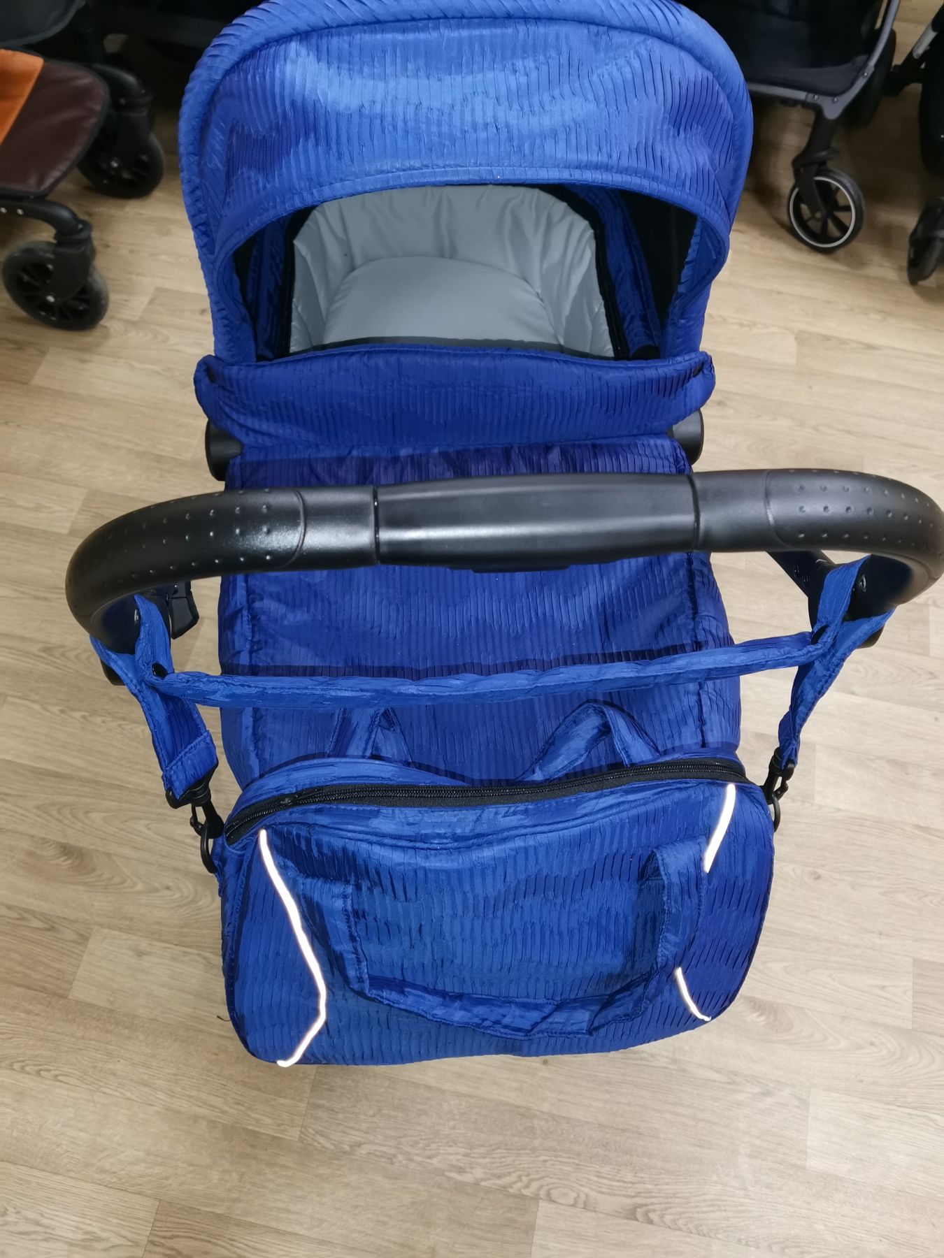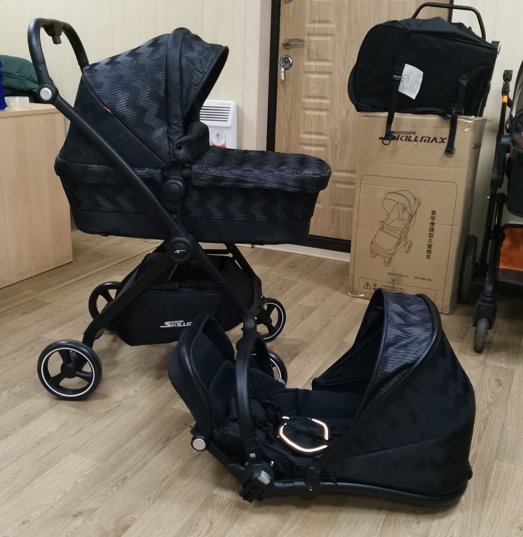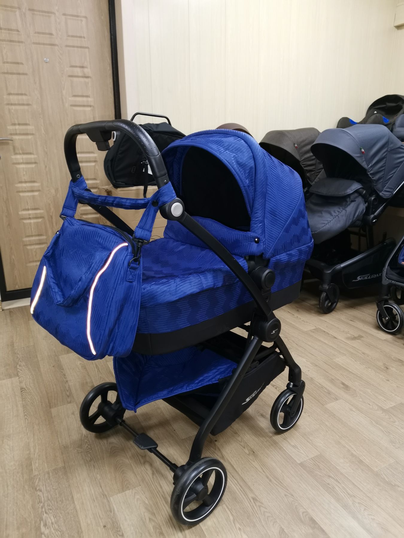 В комплекте: коляска прогулочная, съемная детская люлька, корзина для багажа, утепленный чехол для ног, сумка для детских принадлежностей, мягкая подкладка для сиденья, матрасик для люльки.
