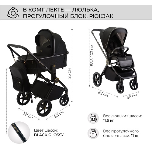 В комплекте: люлька, шасси, дождевик, рюкзак для мамы, прогулочный блок, накидка на ножки, москитная сетка, автокресло.