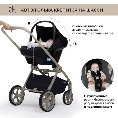 В комплектацию 3 в 1 входит удобное легкое автокресло - переноска для ребенка с рождения до 13 кг. Автокресло обеспечит безопасность ребенка в машине, а вне машины автокресло легко установить на раму коляски. В автокресле есть специальный вкладыш для новорожденного и съемный капюшон от солнышка. В машине автокресло фиксируется штатным автомобильным ремнем.