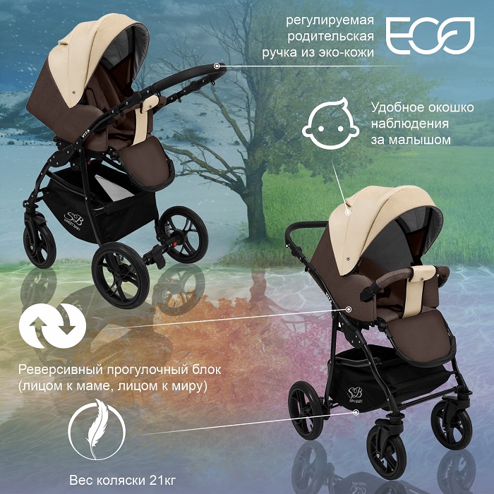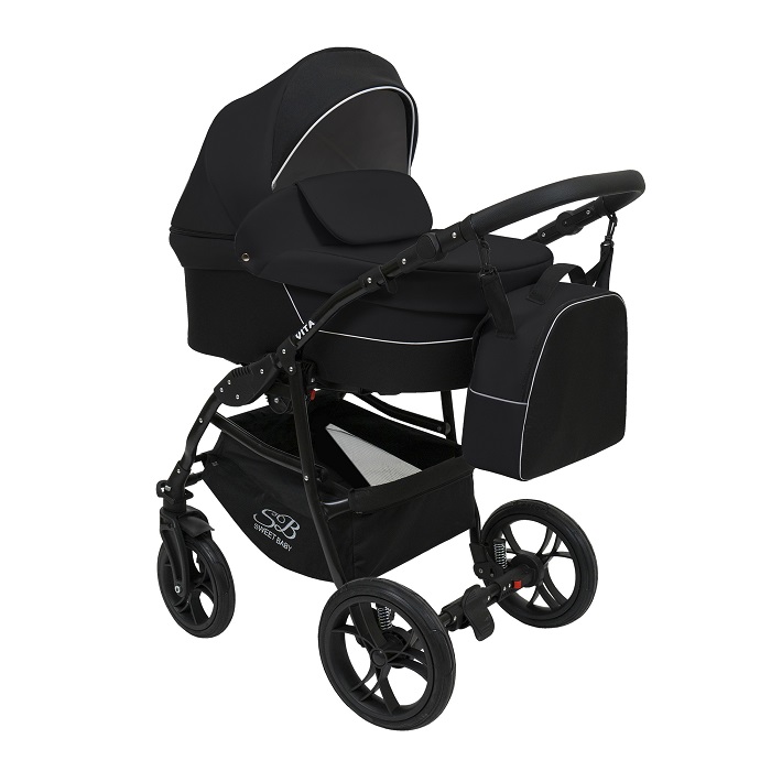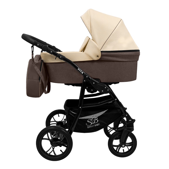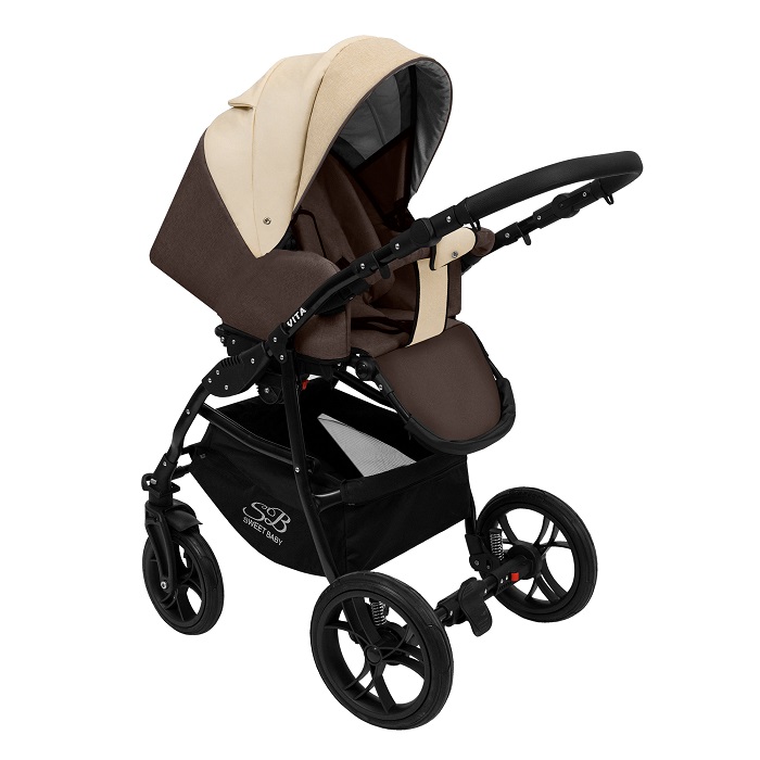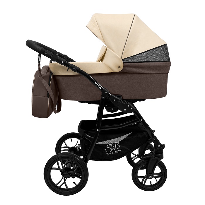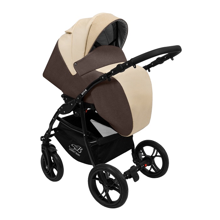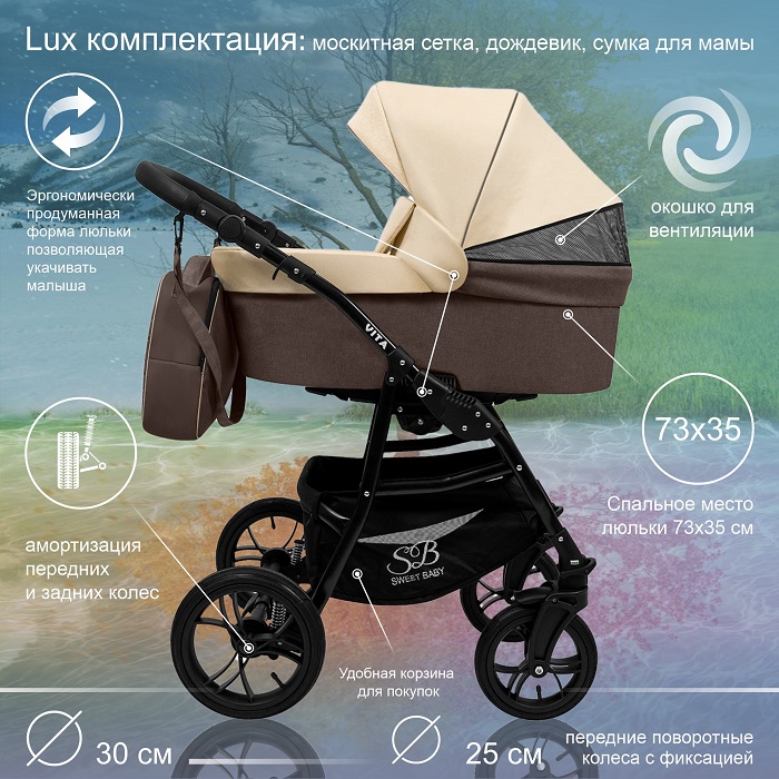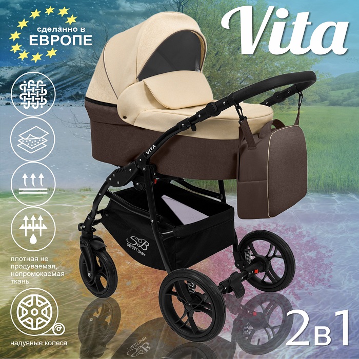 Коляска Sweet Baby Vita 2 в 1 (Свит беби Вита) - детская коляска для комфортных прогулок по городу. Коляска предназначена для ребенка с рождения до 3 лет и состоит из двух сменных блоков: люльки и прогулочного блока и всех необходимых для прогулки аксессуаров. Большие надувные колеса с протекторами и мягкой амортизацией, позволят наслаждаться прогулками даже по бездорожью. Они без труда преодолевают препятствия (сугробы, грязь, бордюры) и отлично передвигаются по любому рельефу. Просторная, эргономичная люлька обеспечит максимальный комфорт и защиту от непогоды. Специальное окно в капюшоне для правильной циркуляции воздуха и температуры внутри. Увеличенный капюшон с козырьком защитит новорожденного от ветра и солнца. Реверсивный прогулочный блок устанавливает на шасси, как по ходу движения, так и лицом к родителям. Регулируемый наклон спинки и подножки позволит подобрать максимально удобное положение для малыша. Увеличенный капор выполнен из защитной и непромокаемой ткани (UPF50+) и оснащен дополнительным солнцезащитным козырьком. Накидка для ножек станет дополнительной защитой во время прогулок в межсезонье.