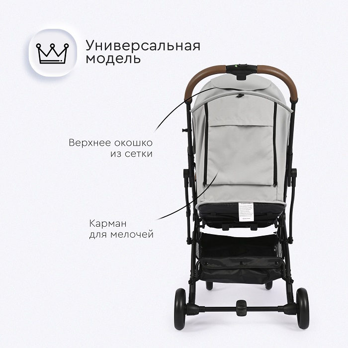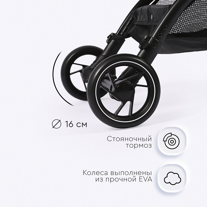 Коляска оснащена практичными колесами EVA, которые отлично подойдут для прогулок по городу и неровным дорожкам. Коляска легко управляется и удобная в эксплуатации.