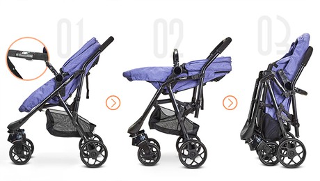 Сложение коляски одной рукой. Стоит в сложенном виде.