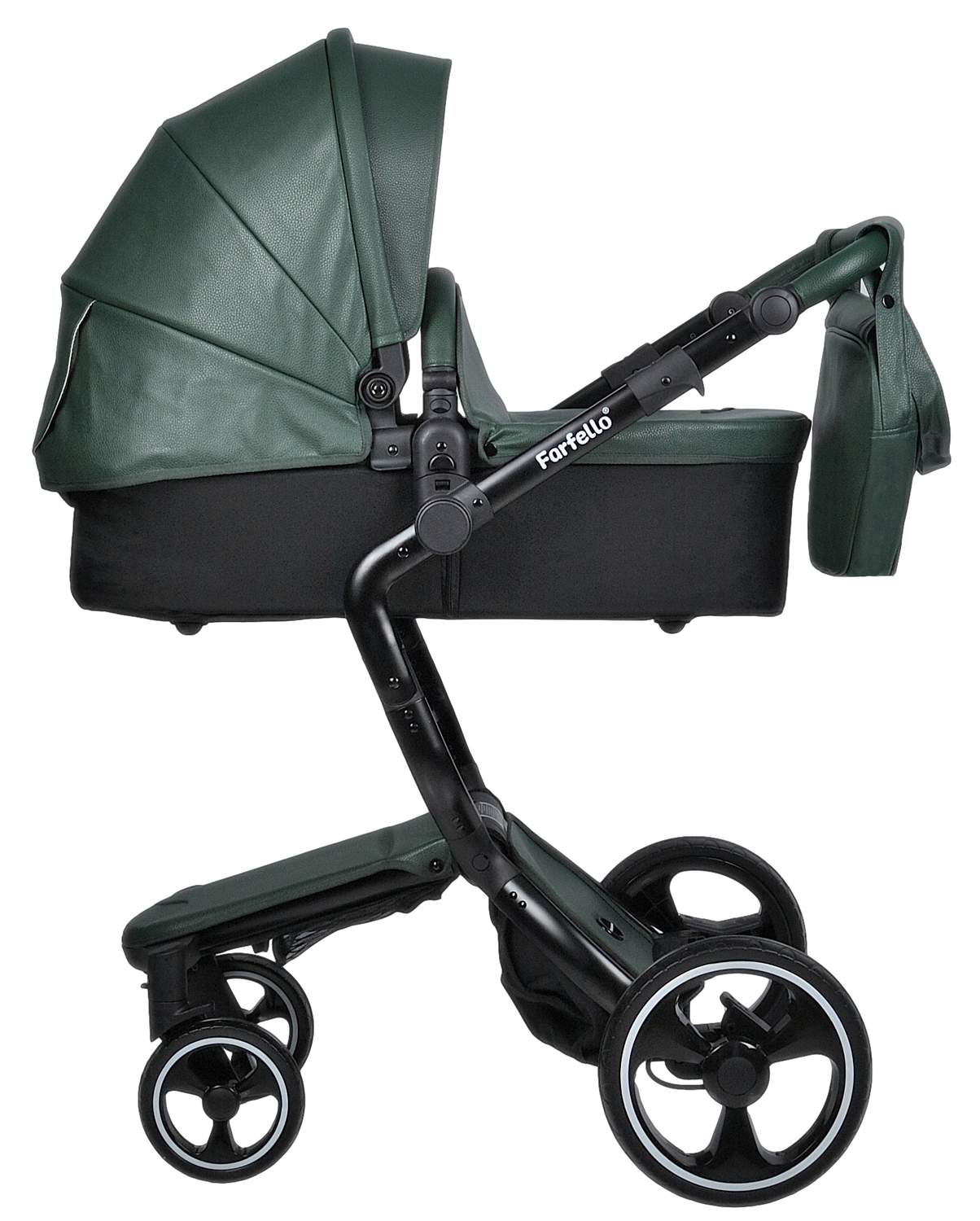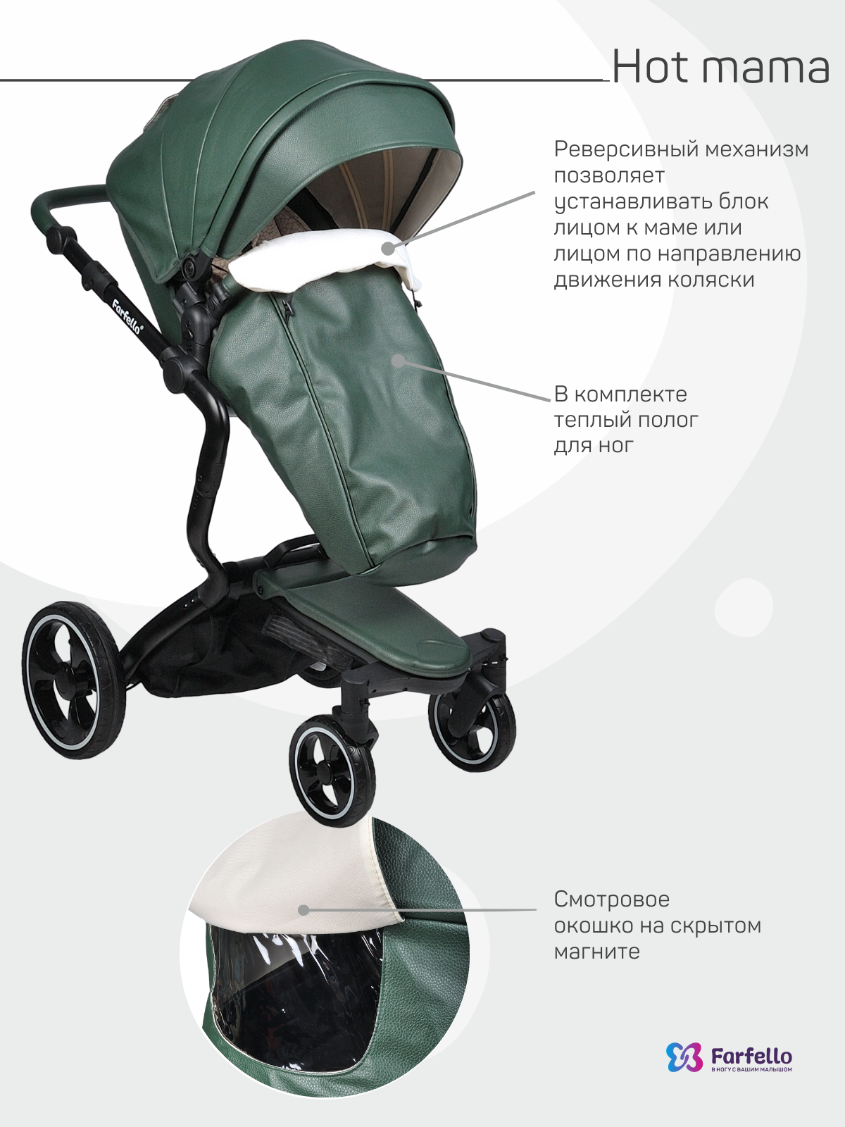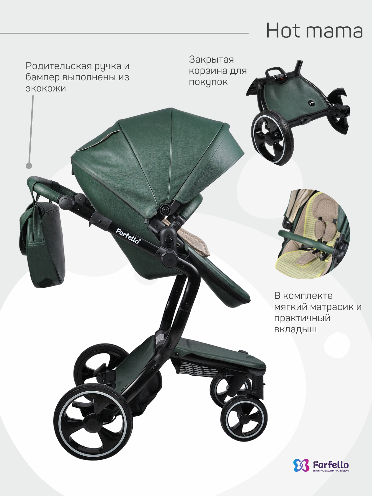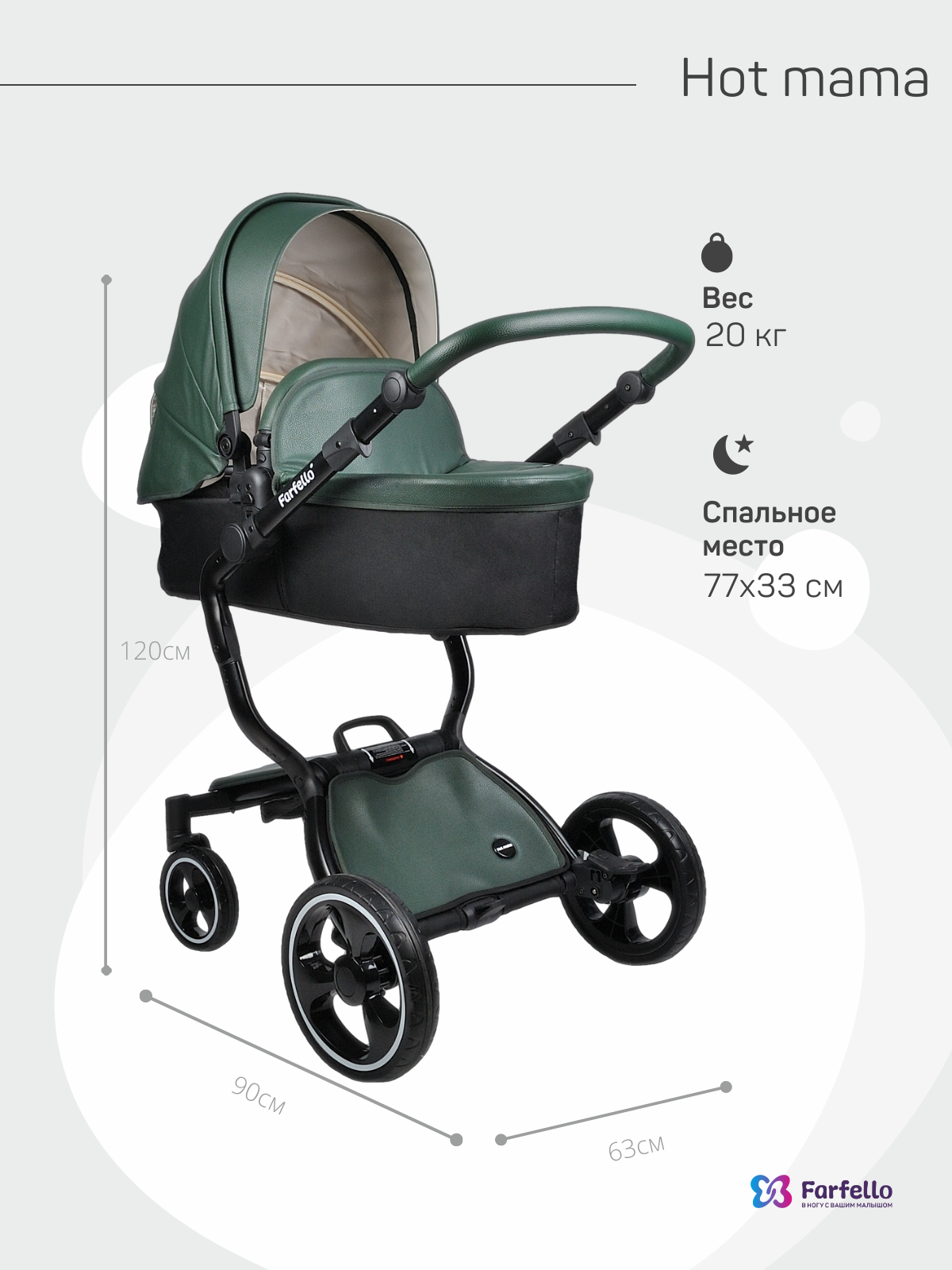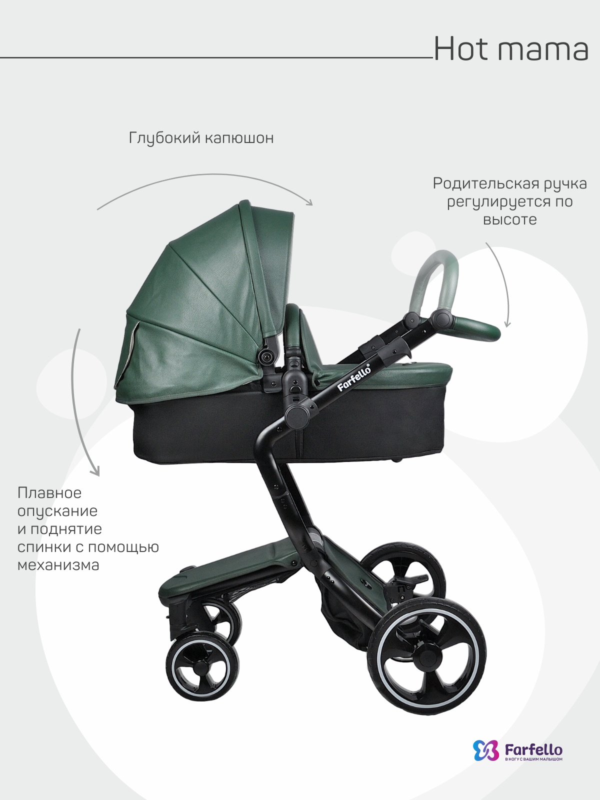 Коляска трансформер 2 в 1 Farfello Hot mama (фарфелло хот мама ) - стильная коляска для новорожденных и детей до 3 лет из эко кожи. Модель отличается необычной элегантной рамой и интересными дизайнерскими решениями. Hot mama это коляска трансформер, у которой люлька и прогулочный блок трансформируются в друг друга. Для новорожденного ребенка предусмотрена полноценная люлька с ровным дном и мягким матрасиком. Размер люльки 77х33 см (внутренние размеры), что отлично подойдет для ребенка с рождения до 6-7 месяцев. В дальнейшем люлька трансформируется в очень дизайнерский прогулочный блок, который идет в комплекте с мягким ярким матрасиком. Модель дополнена утепленными накидками на люльку и прогулочный блок из эко кожи, меховым матрасиком с удобной молнией по середине, муфтой для рук в цвет коляски и сумкой для мамы.