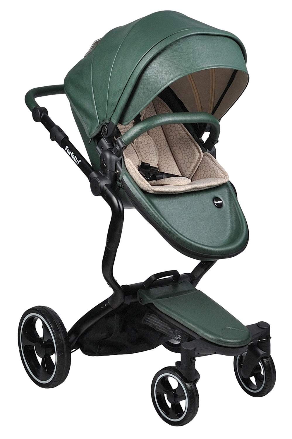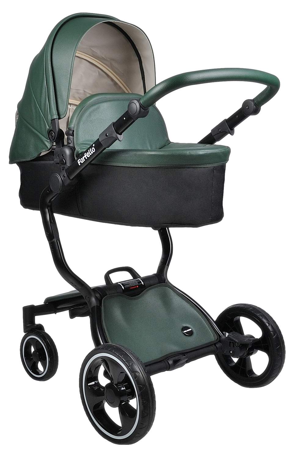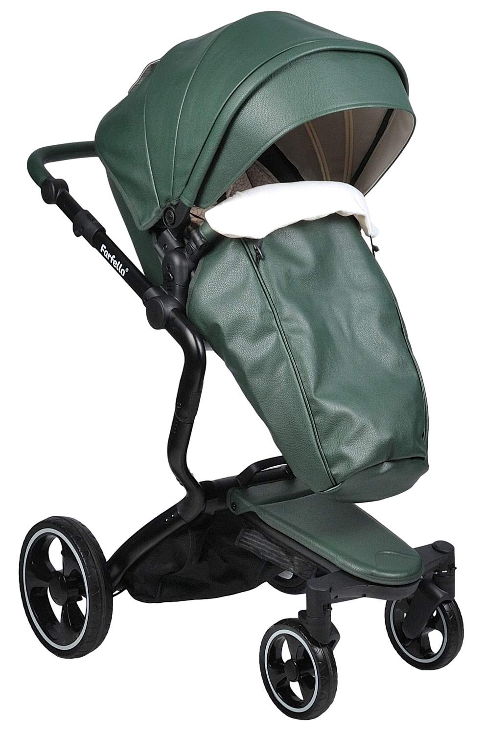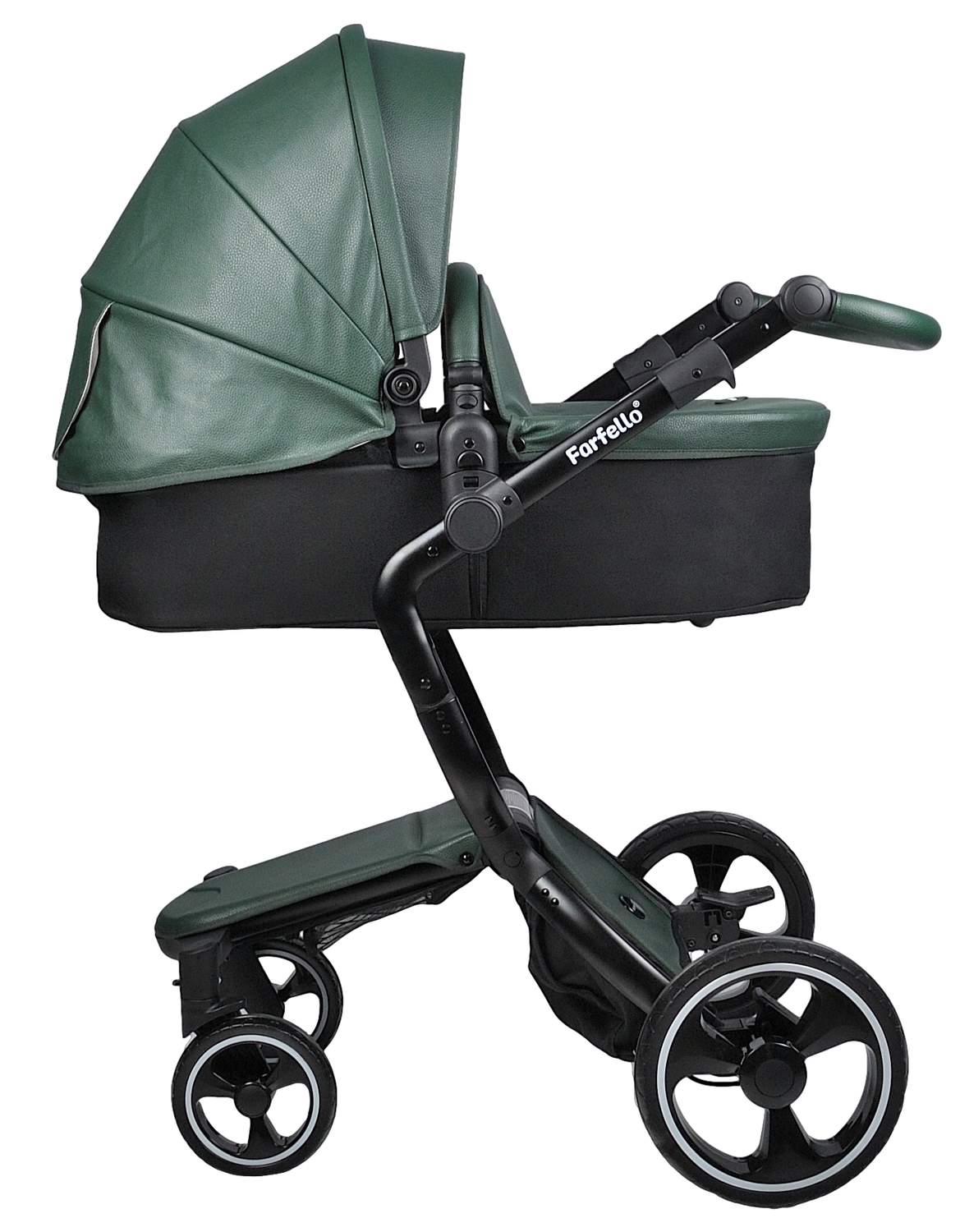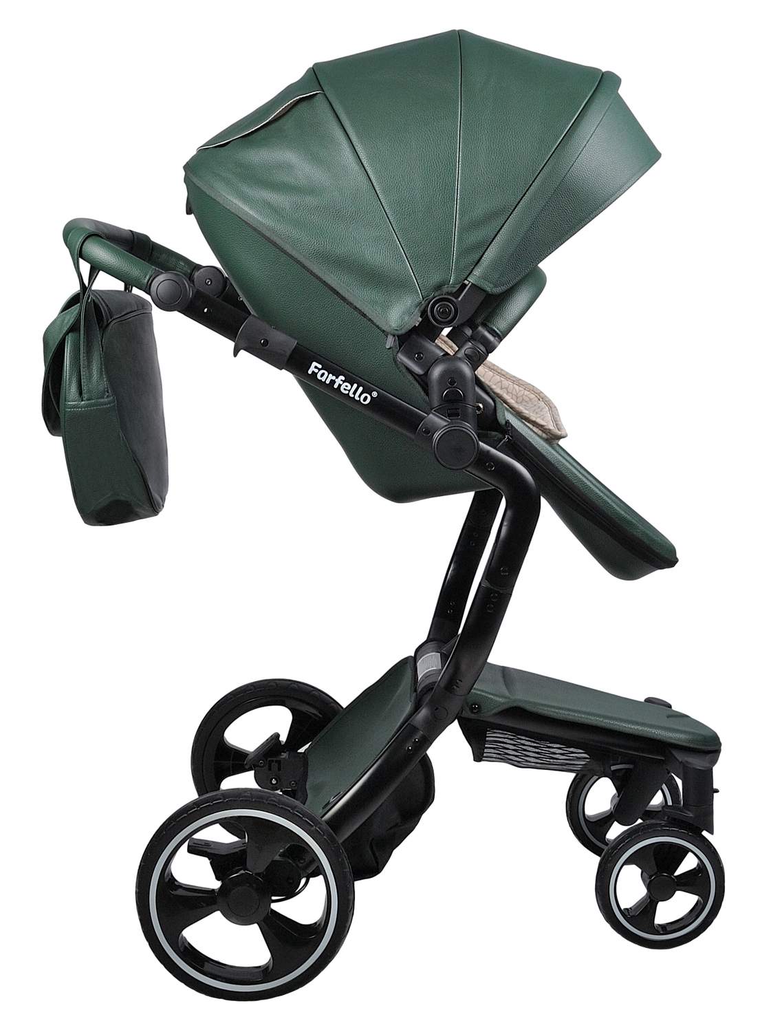 Коляска трансформер 2 в 1 Farfello Hot mama (фарфелло хот мама ) - стильная коляска для новорожденных и детей до 3 лет из эко кожи. Модель отличается необычной элегантной рамой и интересными дизайнерскими решениями. Hot mama это коляска трансформер, у которой люлька и прогулочный блок трансформируются в друг друга. Для новорожденного ребенка предусмотрена полноценная люлька с ровным дном и мягким матрасиком. Размер люльки 77х33 см (внутренние размеры), что отлично подойдет для ребенка с рождения до 6-7 месяцев. В дальнейшем люлька трансформируется в очень дизайнерский прогулочный блок, который идет в комплекте с мягким ярким матрасиком. Модель дополнена утепленными накидками на люльку и прогулочный блок из эко кожи, меховым матрасиком с удобной молнией по середине, муфтой для рук в цвет коляски и сумкой для мамы.