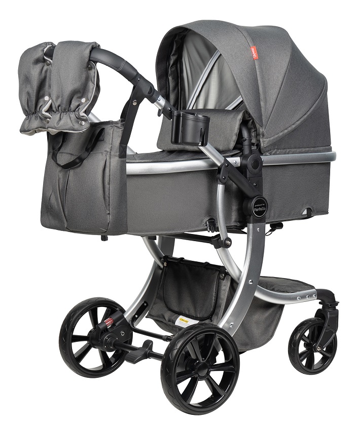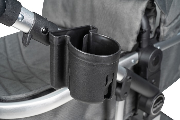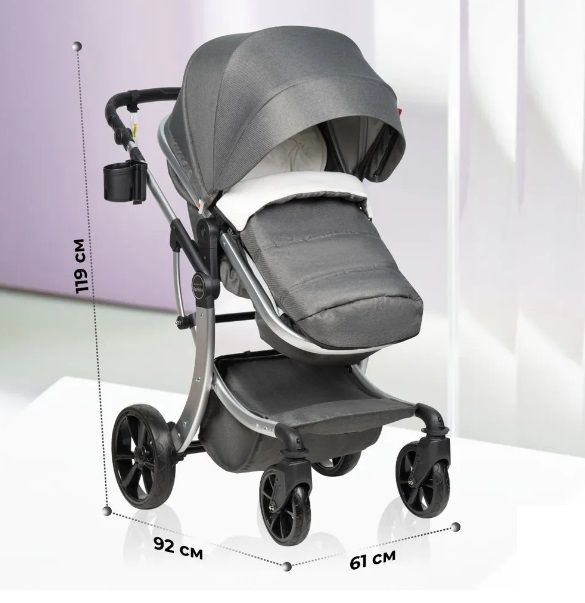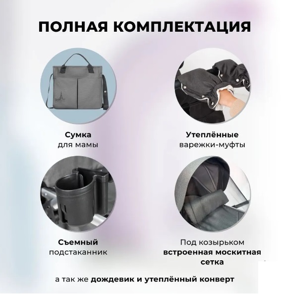 Коляска комплектуется удобным подстаканником, большим многофункциональным флисовым конвертом для ребенка, дождевиком и сумкой органайзером, варежки.