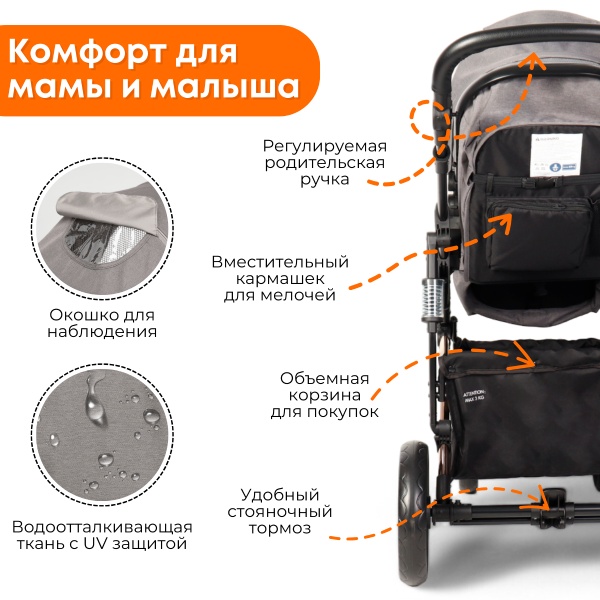 - Обивка коляски выполнена из плотной ткани с защитной водооталкивающей пропиткой и защитой от UV излучения, предотвращающей загрязнение, выгорание и проникновение влаги.
