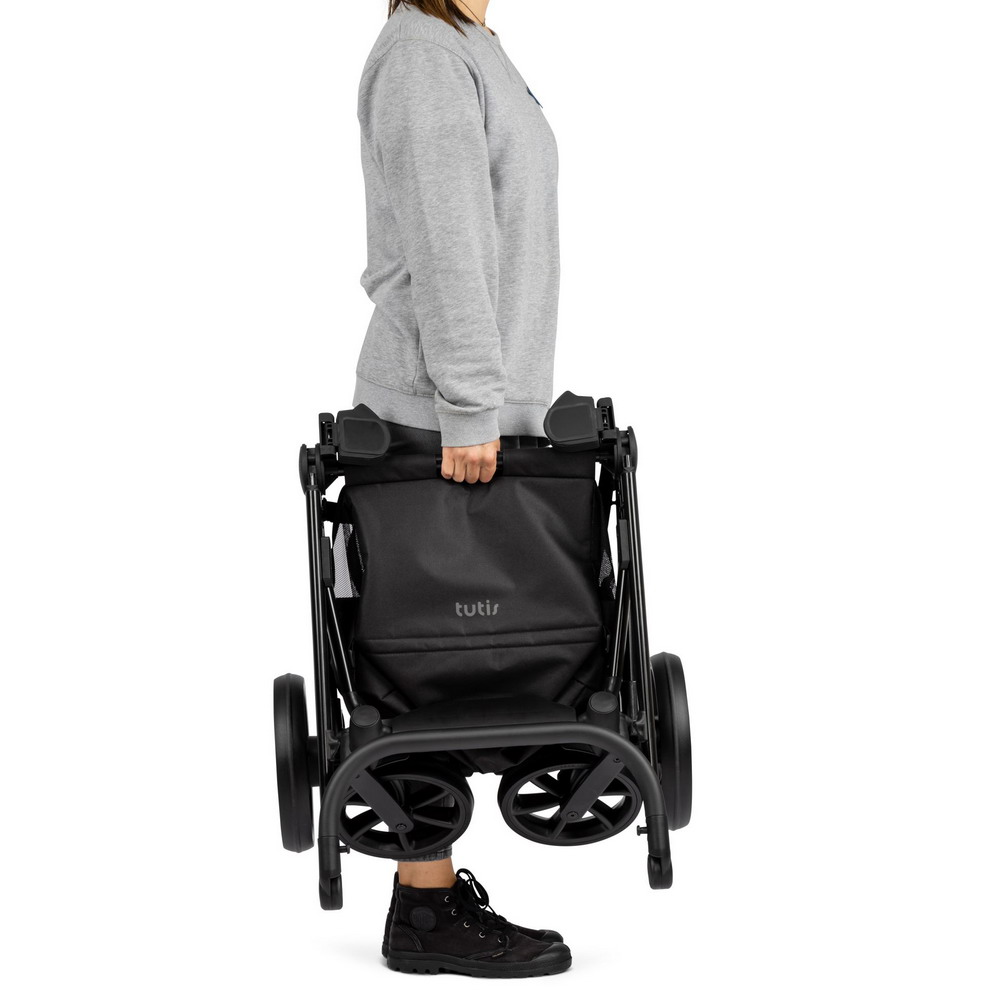 Прогулочный блок коляски 2 в 1 Tutis Mio можно сложить вместе с шасси в обе стороны. В сложенном виде Тутис Мио достаточно компактна. Функция вместе с выдвижной тканевой ручкой обеспечивает легкую транспортировку вверх и вниз по лестнице, а также на подъеме и высадке из автомобиля.