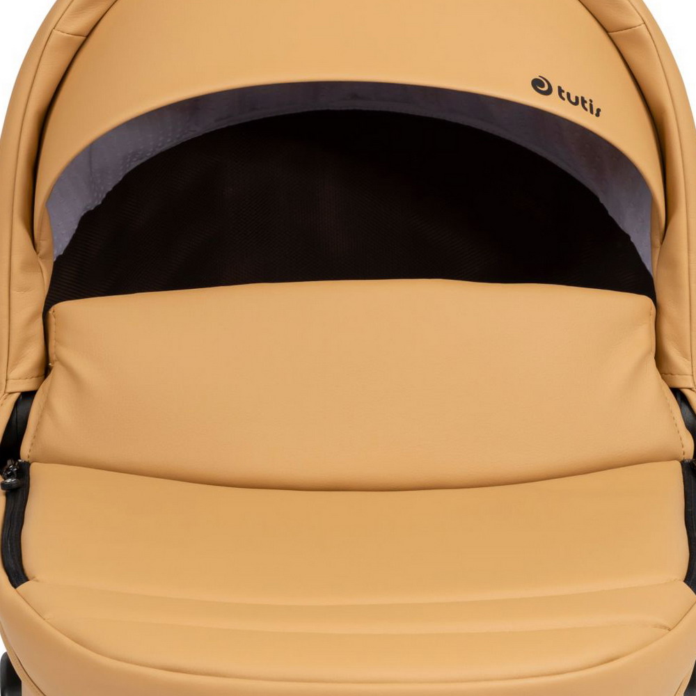 Капюшон коляски 2 в 1 Tutis Mio Eco-Leather имеет дополнительный капюшон с панорамным сетчатым окошком, обеспечивающим наибольшую вентиляцию и позволяющим ребенку наблюдать за небом и движущимися облаками. Вентиляционное окно можно открыть или закрыть с помощью молнии.