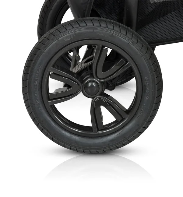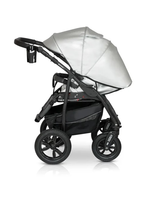 Рама коляски очень компактная и удобная. Она оснащена большими надувными колесами и регулируемой амортизацией, которая сгладит все неровности дороги и подарит ребенку комфортный сон. Модель управляется легко за счет регулируемой по высоте ручки и передним поворотным колесам с блокировкой. Большая комплектация позволит комфортно гулять в любую погоду и не докупать ни чего дополнительно.